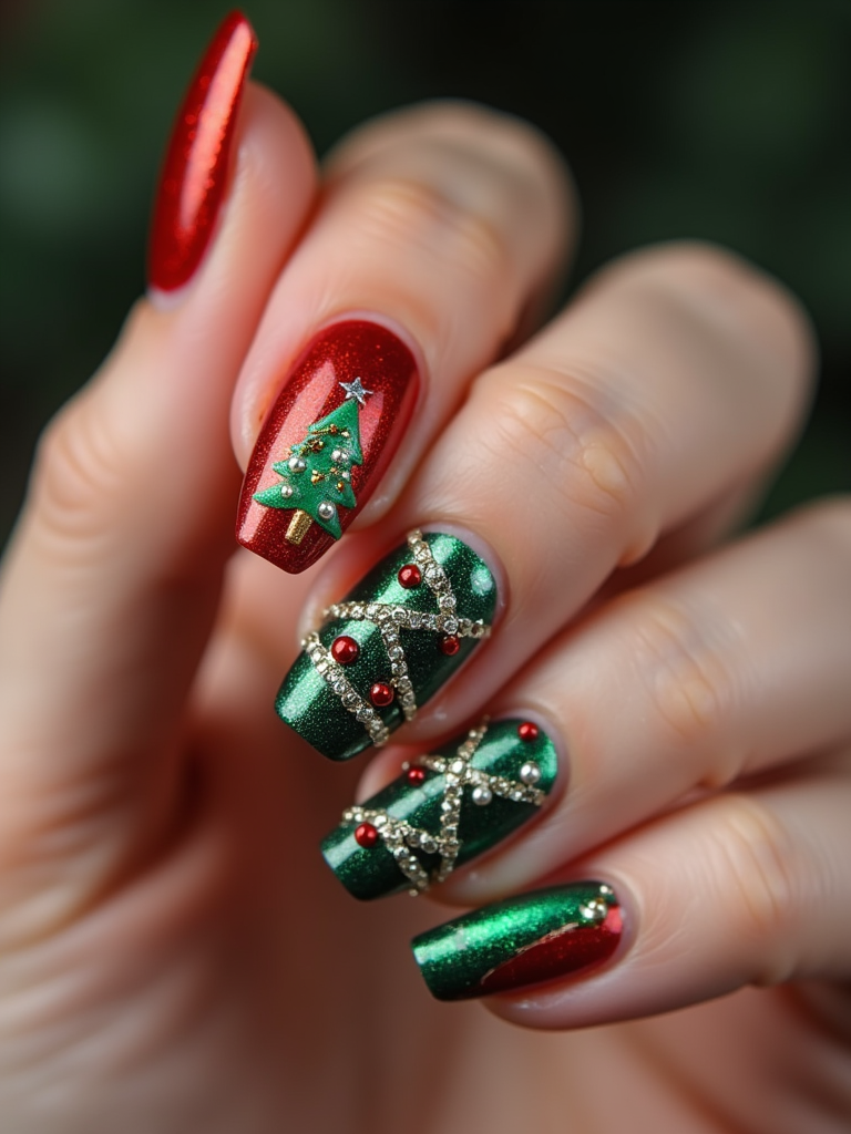 Christmas tree themed nails with tiny ornaments and glitter, festive red and green colors, elegant hand pose, holiday-inspired nail art