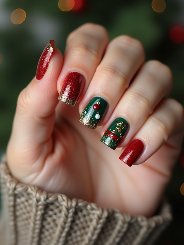 Christmas tree themed nails with tiny ornaments and glitter, festive red and green colors, elegant hand pose, holiday-inspired nail art