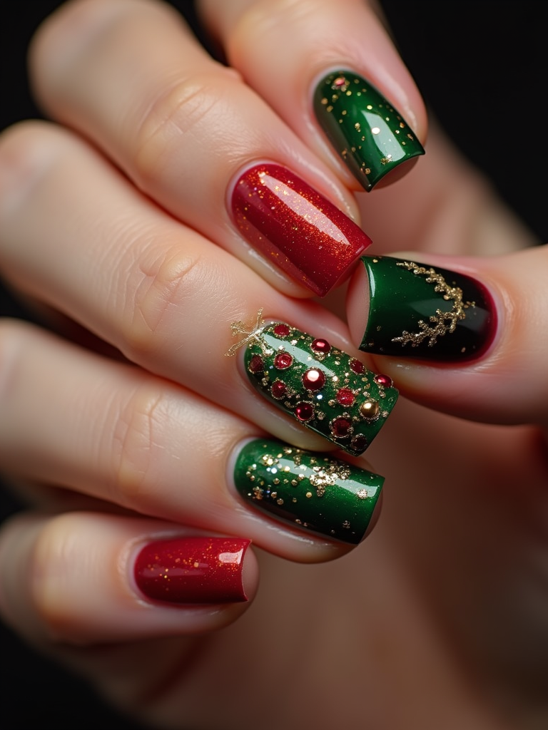 Christmas tree themed nails with tiny ornaments and glitter, festive red and green colors, elegant hand pose, holiday-inspired nail art
