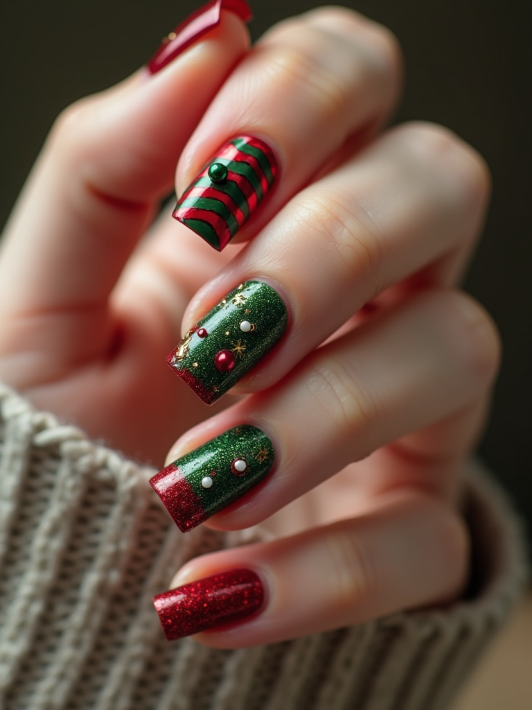 Christmas tree themed nails with tiny ornaments and glitter, festive red and green colors, elegant hand pose, holiday-inspired nail art