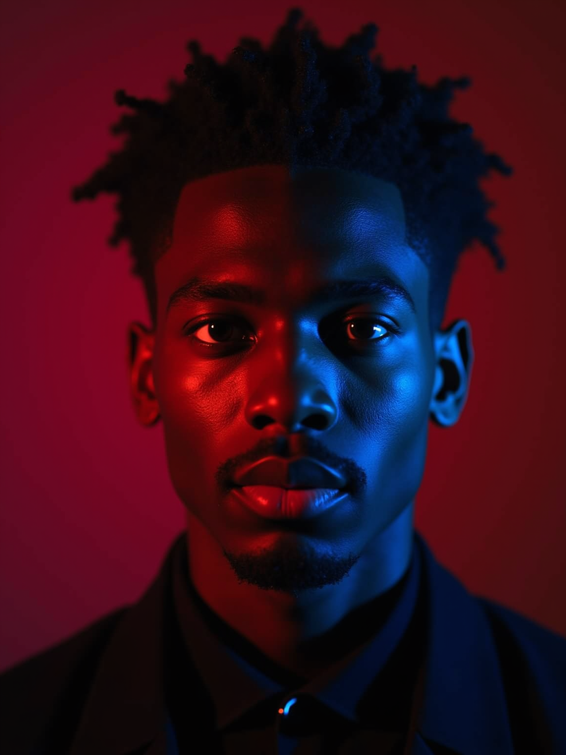 Cinematic close-up portrait of a beautiful model, captured in moody dramatic lighting. The scene uses vibrant RGB gel lights — soft blue, deep magenta, warm red, or glowing yellow — to create a surreal and atmospheric look. Shadows fall across their face for depth. model is wearing a black or dark outfit. Backgrounds vary: dark gradient, red wall, or glowing window light. High contrast, bold color separation, fashion editorial, neon noir aesthetic