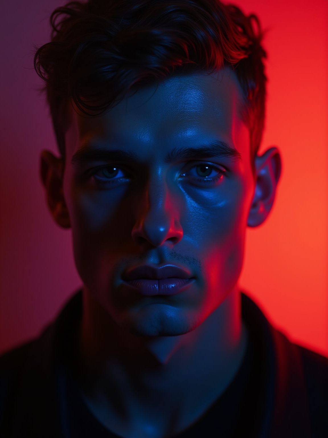 Cinematic close-up portrait of a beautiful model, captured in moody dramatic lighting. The scene uses vibrant RGB gel lights — soft blue, deep magenta, warm red, or glowing yellow — to create a surreal and atmospheric look. Shadows fall across their face for depth. model is wearing a black or dark outfit. Backgrounds vary: dark gradient, red wall, or glowing window light. High contrast, bold color separation, fashion editorial, neon noir aesthetic