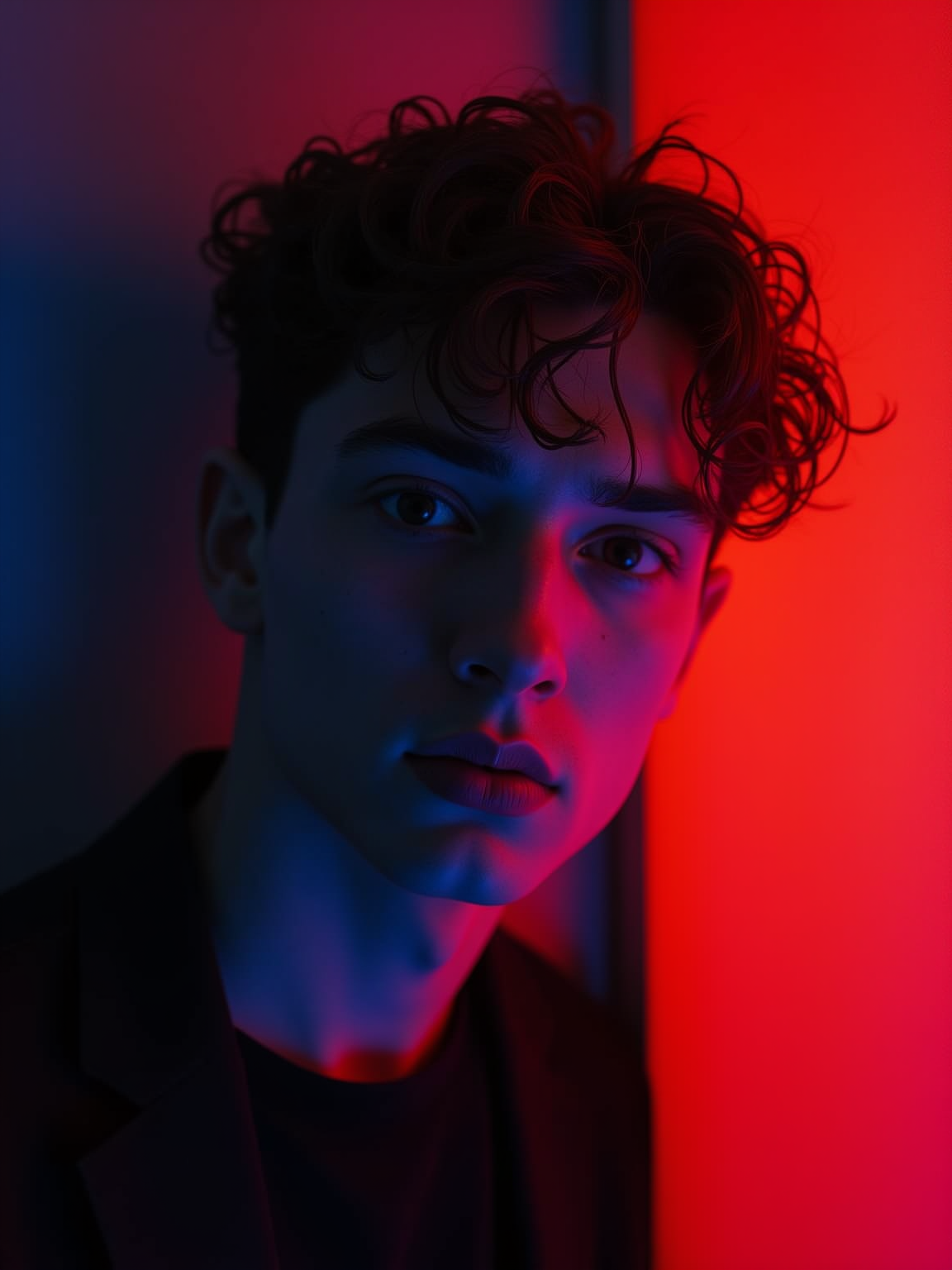 Cinematic close-up portrait of a beautiful model, captured in moody dramatic lighting. The scene uses vibrant RGB gel lights — soft blue, deep magenta, warm red, or glowing yellow — to create a surreal and atmospheric look. Shadows fall across their face for depth. model is wearing a black or dark outfit. Backgrounds vary: dark gradient, red wall, or glowing window light. High contrast, bold color separation, fashion editorial, neon noir aesthetic