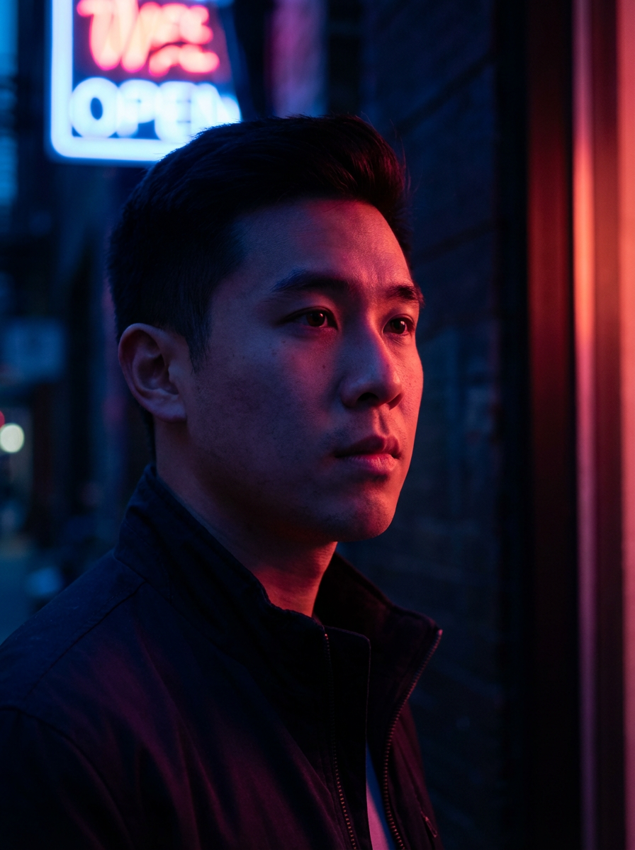 Cinematic close-up portrait of a beautiful model, captured in moody dramatic lighting. The scene uses vibrant RGB gel lights — soft blue, deep magenta, warm red, or glowing yellow — to create a surreal and atmospheric look. Shadows fall across their face for depth. model is wearing a black or dark outfit. Backgrounds vary: dark gradient, red wall, or glowing window light. High contrast, bold color separation, fashion editorial, neon noir aesthetic