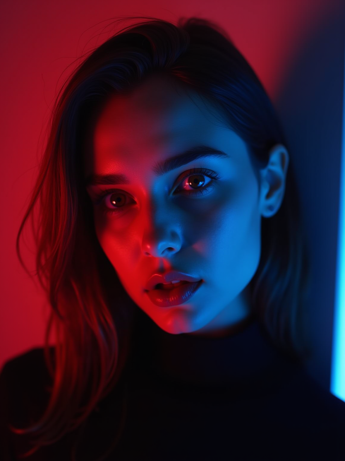Cinematic close-up portrait of a beautiful model, captured in moody dramatic lighting. The scene uses vibrant RGB gel lights — soft blue, deep magenta, warm red, or glowing yellow — to create a surreal and atmospheric look. Shadows fall across their face for depth. model is wearing a black or dark outfit. Backgrounds vary: dark gradient, red wall, or glowing window light. High contrast, bold color separation, fashion editorial, neon noir aesthetic