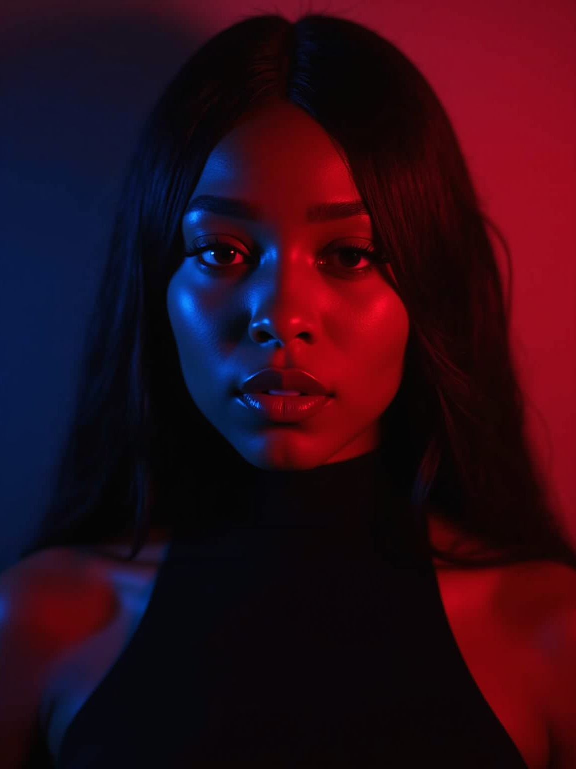 Cinematic close-up portrait of a beautiful model, captured in moody dramatic lighting. The scene uses vibrant RGB gel lights — soft blue, deep magenta, warm red, or glowing yellow — to create a surreal and atmospheric look. Shadows fall across their face for depth. model is wearing a black or dark outfit. Backgrounds vary: dark gradient, red wall, or glowing window light. High contrast, bold color separation, fashion editorial, neon noir aesthetic