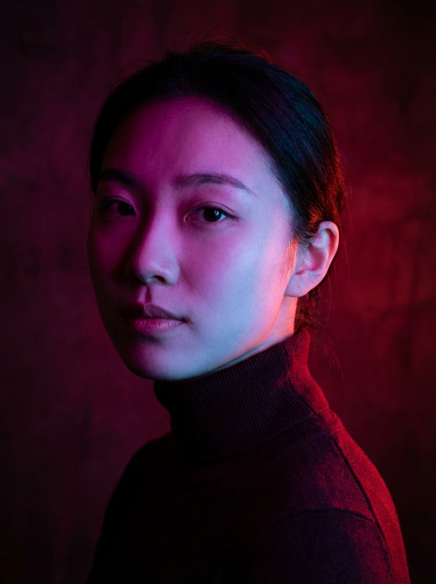 Cinematic close-up portrait of a beautiful model, captured in moody dramatic lighting. The scene uses vibrant RGB gel lights — soft blue, deep magenta, warm red, or glowing yellow — to create a surreal and atmospheric look. Shadows fall across their face for depth. model is wearing a black or dark outfit. Backgrounds vary: dark gradient, red wall, or glowing window light. High contrast, bold color separation, fashion editorial, neon noir aesthetic