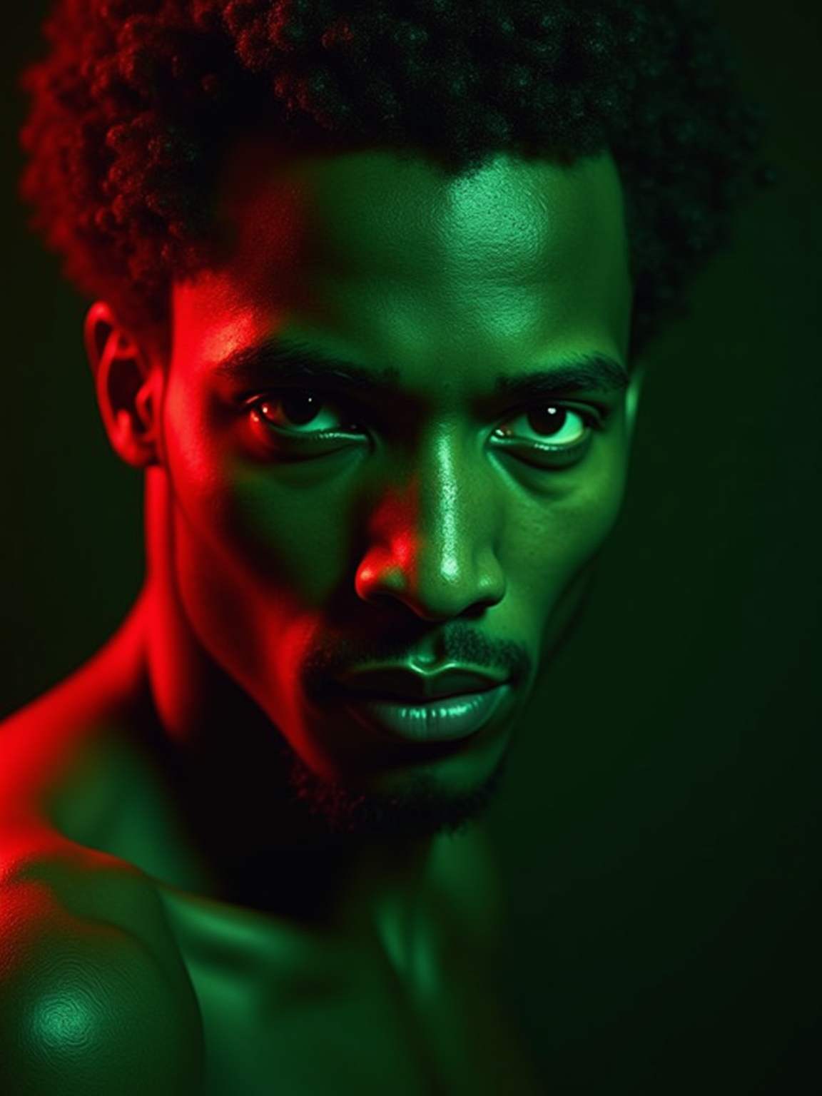 Cinematic close-up portrait of a mysterious model with intense green and red split lighting. Model has piercing eyes. Model has a seductive and moody vibe. The background is softly blurred, emphasizing dramatic lighting contrast and a noir-inspired atmosphere