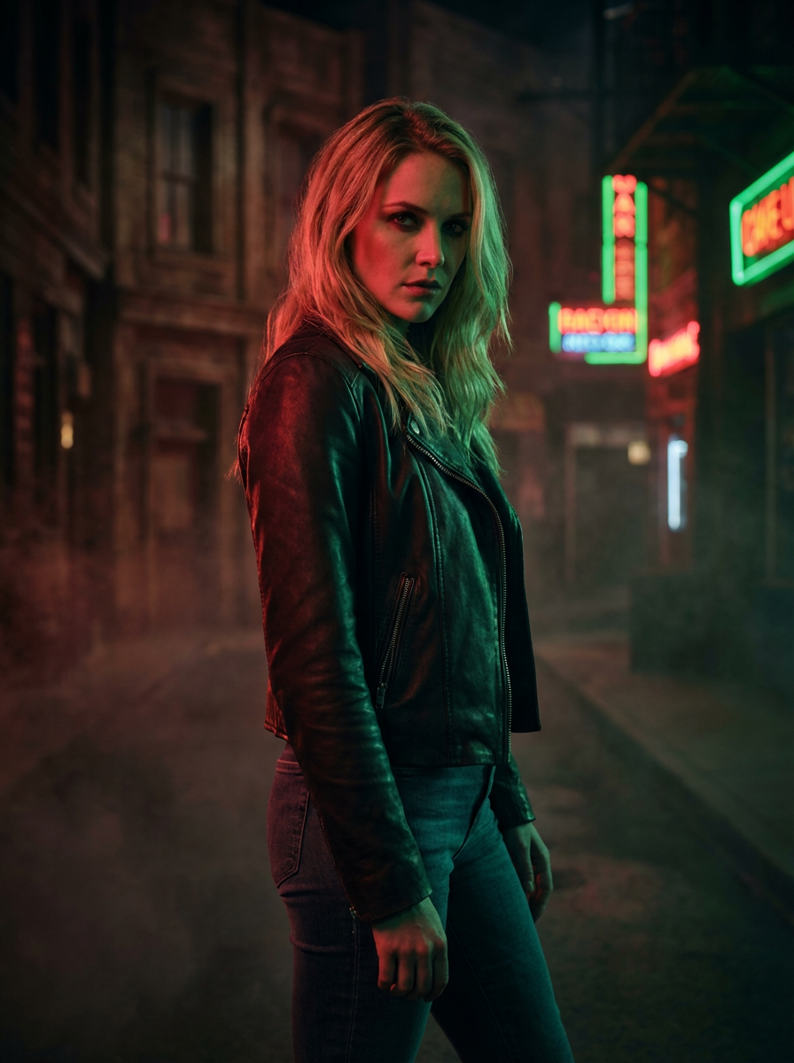 Related photosClose-up portrait of a confident woman with arms raised above their head, wearing a white outfit. The lighting is bold and vibrant, with strong magenta, orange, and electric blue tones casting dramatic highlights and shadows across their face and arms. Studio background is dark and minimal, emphasizing the neon glow on the skin and hairDramatic studio portrait of a confident woman, looking over their shoulder. Wearing a form-fitting black outfit. The lighting is intense and cinematic, with strong red and teal color contrast illuminating their hair and skin, casting moody shadows. The background is dark and atmosphericCinematic close-up portrait of a mysterious woman with intense green and red lighting. Model has piercing eyes. Model has a seductive and moody vibe. The background is softly blurred, emphasizing dramatic lighting contrast and a noir-inspired atmospherewoman, gta vice city cover art, borderlands style, celshading, trending on artstation, by rhads, andreas rocha, rossdraws, makoto shinkai, laurie greasley, lois van baarle, ilya kuvshinov and greg rutkowskistylish and chic  woman in Berlin wearing a punk-inspired outfit, Brandenburg Gate in the backgroundclose-up of Edgy makeup look with dark, glossy lips and contoured cheeks. set against a soft, pastel background