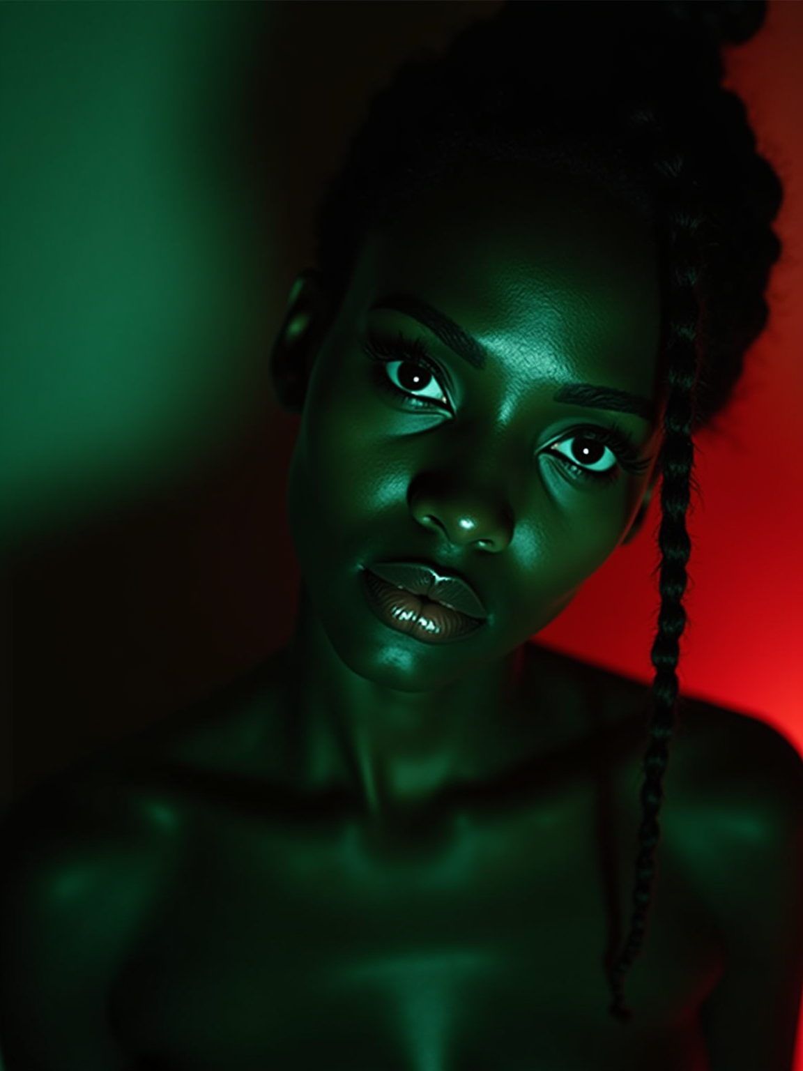 Cinematic close-up portrait of a mysterious model with intense green and red split lighting. Model has piercing eyes. Model has a seductive and moody vibe. The background is softly blurred, emphasizing dramatic lighting contrast and a noir-inspired atmosphere
