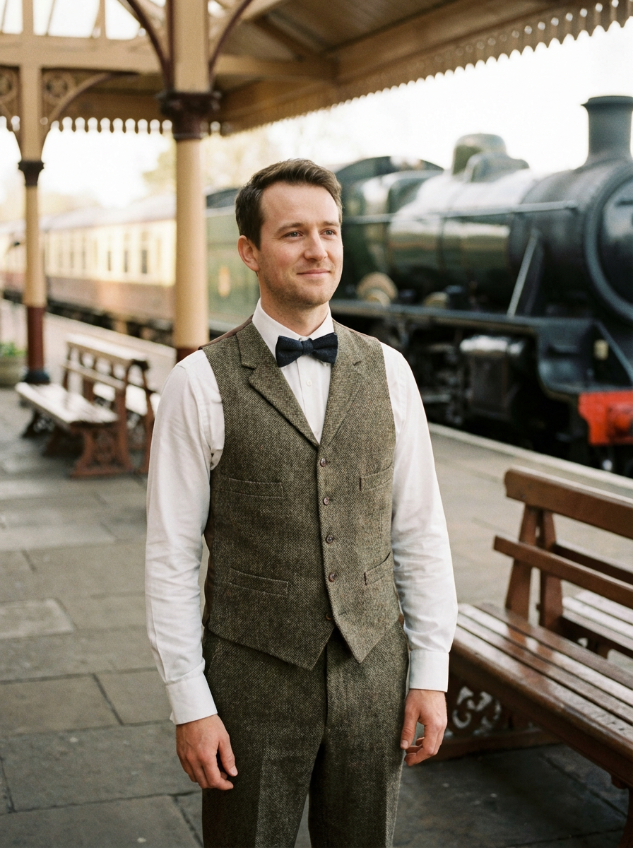 Cinematic engagement shoot at a vintage train station. Model wearing a classic vest and bowtie . Classic romance movie aesthetic.