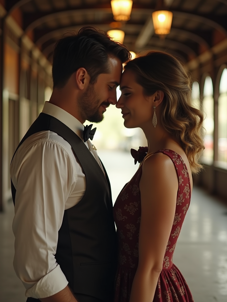 Cinematic engagement shoot at a vintage train station. Wearing a classic vest and bowtie . Classic romance movie aesthetic.
