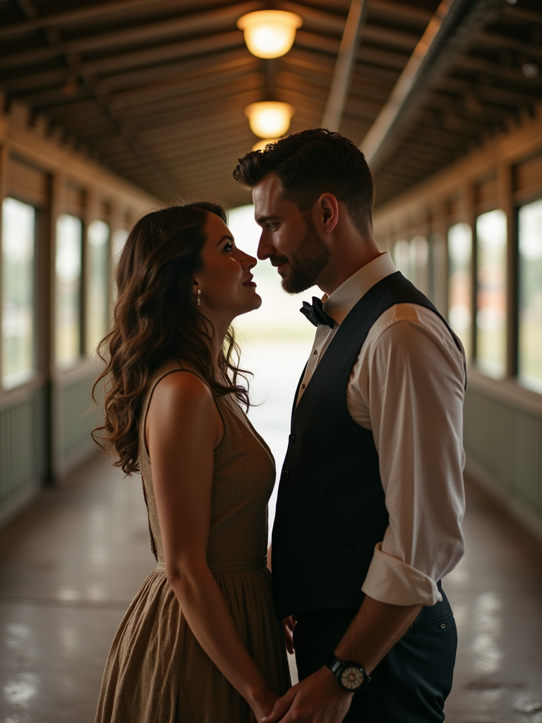 Cinematic engagement shoot at a vintage train station. Wearing a classic vest and bowtie . Classic romance movie aesthetic.