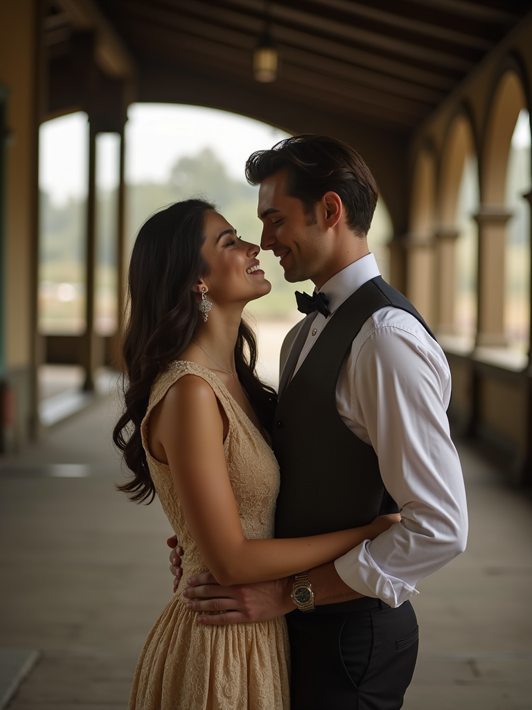 Cinematic engagement shoot at a vintage train station. Wearing a classic vest and bowtie . Classic romance movie aesthetic.