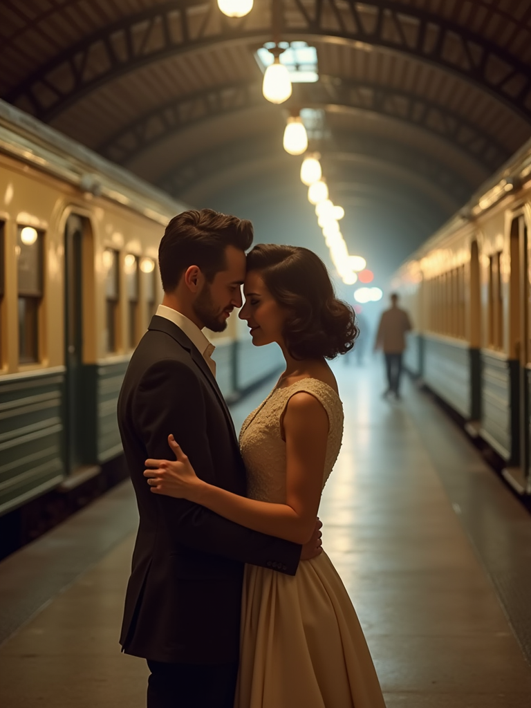 Cinematic engagement shoot at a vintage train station. Wearing a stylish 1950s-inspired dress . Classic romance movie aesthetic.