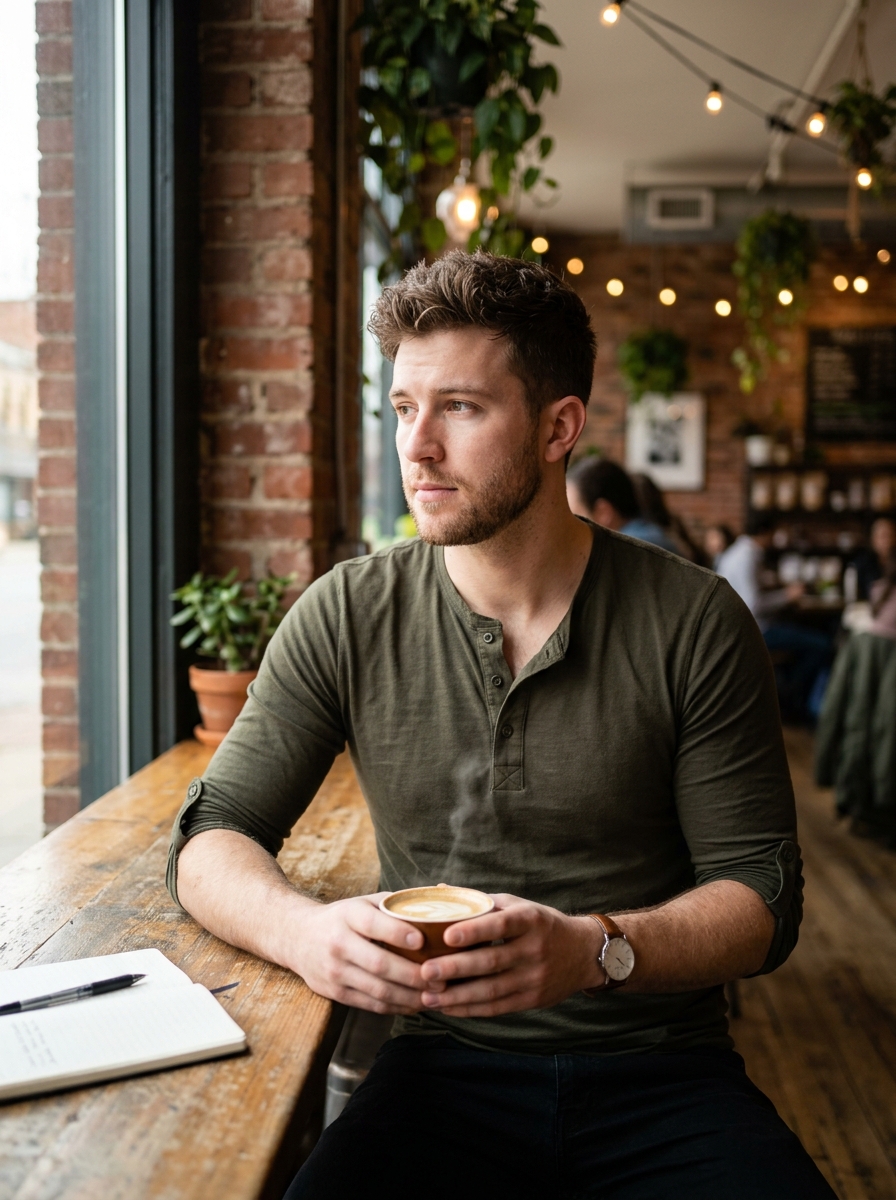 Cinematic portrait of young model in a cozy coffee shop setting, sitting by a large window with soft natural light streaming in. Wearing fitted henley shirt with sleeves pushed up. Hair: textured short style. Holding a ceramic latte cup with both hands, steam rising softly. Expression is relaxed and contemplative, looking slightly off-camera. Background shows blurred warm interior with brick and hanging plants. Shot on 85mm lens, f/1.8, shallow depth of field, warm color grading. Skin shows natural texture with soft highlights on cheekbones. Clean natural look. Accessories: simple watch. Mood is , authentic, lifestyle photography aesthetic.