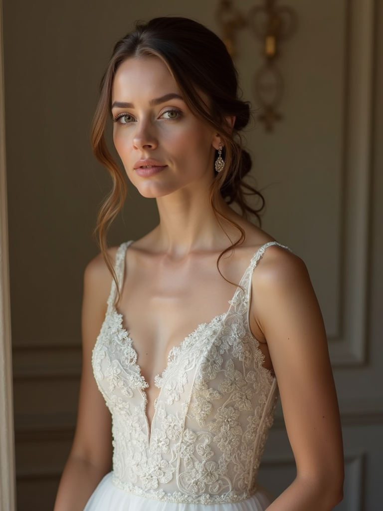 Classic wedding elegance in an intimate ceremony. Model wearing a silk A-line wedding dress with lace detailing . Romantic and sophisticated.