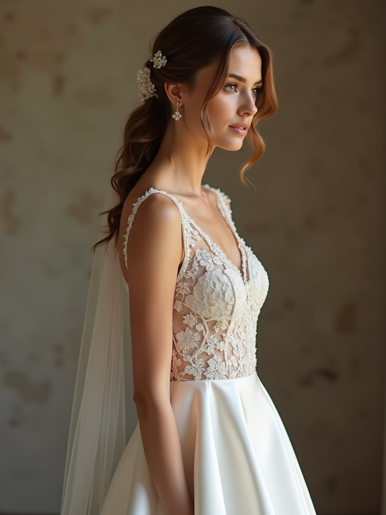 Classic wedding elegance in an intimate ceremony. Model wearing a silk A-line wedding dress with lace detailing . Romantic and sophisticated.