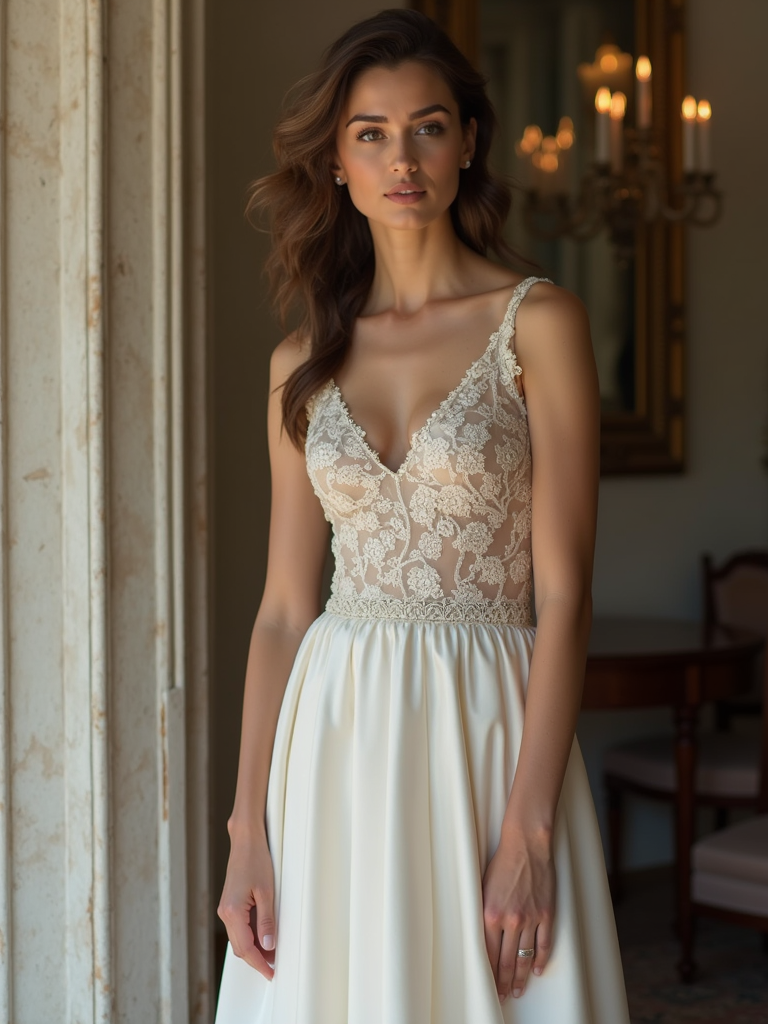 Classic wedding elegance in an intimate ceremony. Model wearing a silk A-line wedding dress with lace detailing . Romantic and sophisticated.