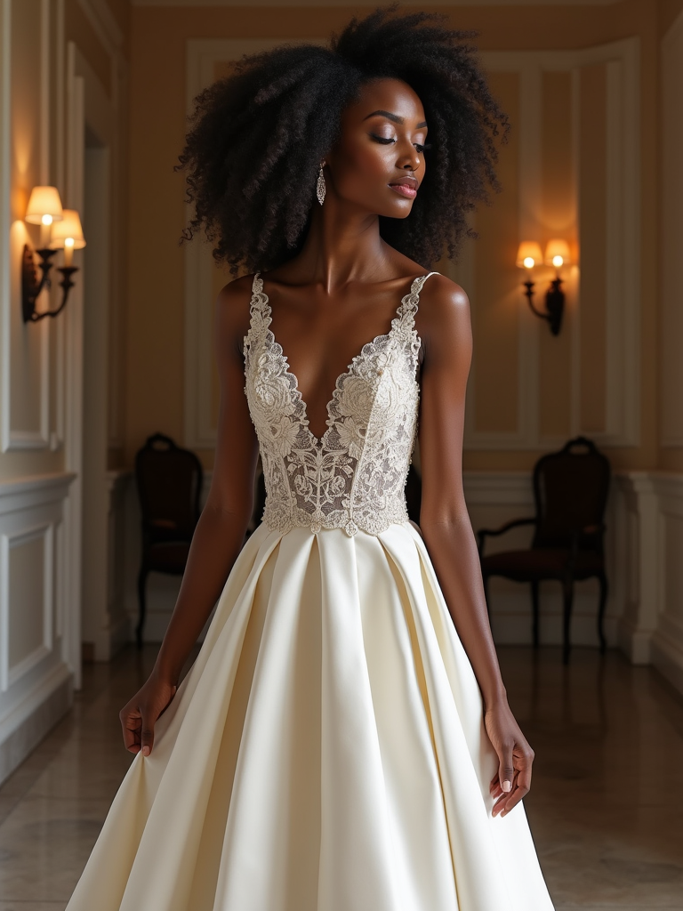 Classic wedding elegance in an intimate ceremony. Model wearing a silk A-line wedding dress with lace detailing . Romantic and sophisticated.
