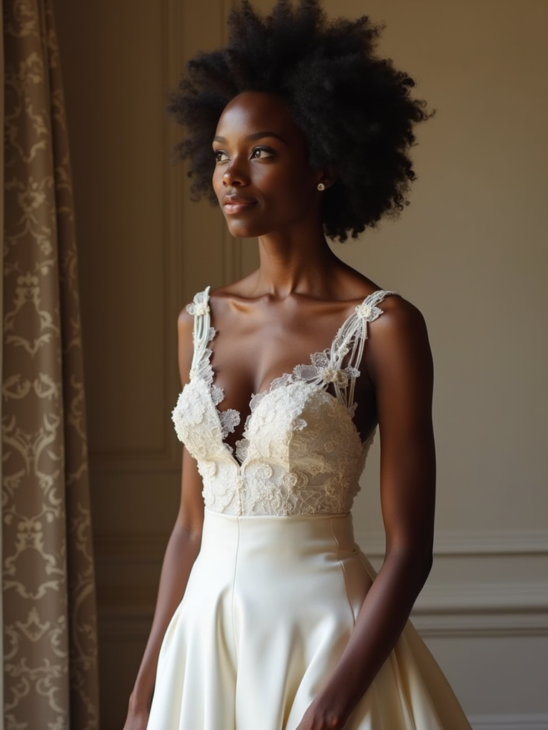 Classic wedding elegance in an intimate ceremony. Model wearing a silk A-line wedding dress with lace detailing . Romantic and sophisticated.