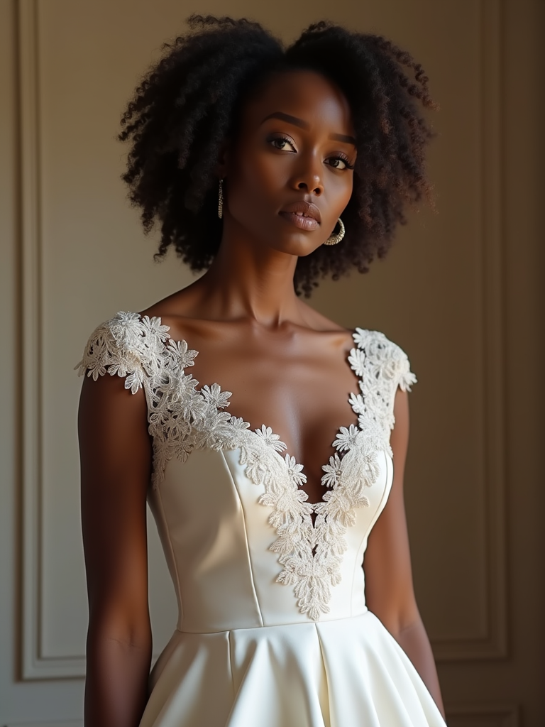 Classic wedding elegance in an intimate ceremony. Model wearing a silk A-line wedding dress with lace detailing . Romantic and sophisticated.
