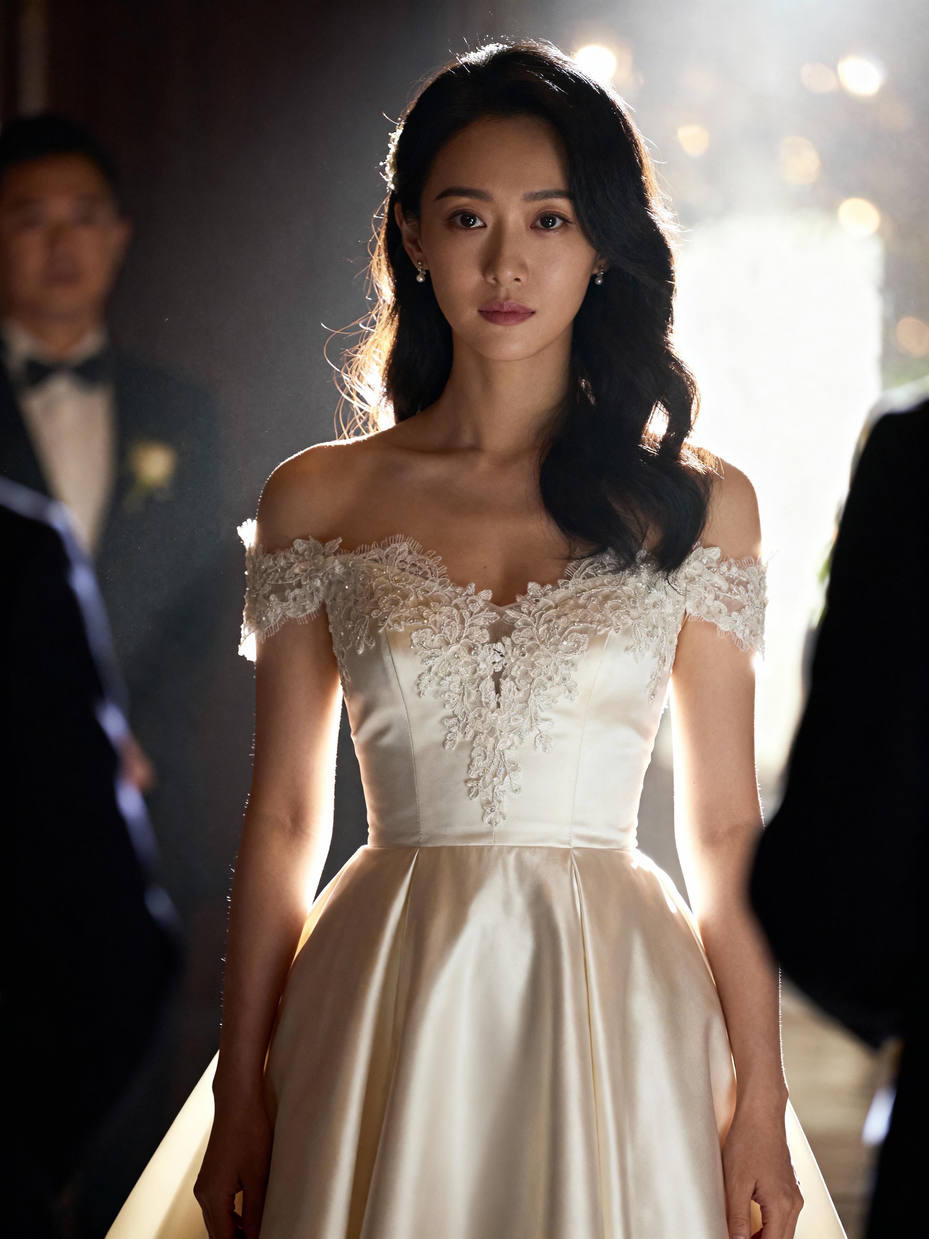 Classic wedding elegance in an intimate ceremony. Model wearing a silk A-line wedding dress with lace detailing . Romantic and sophisticated.