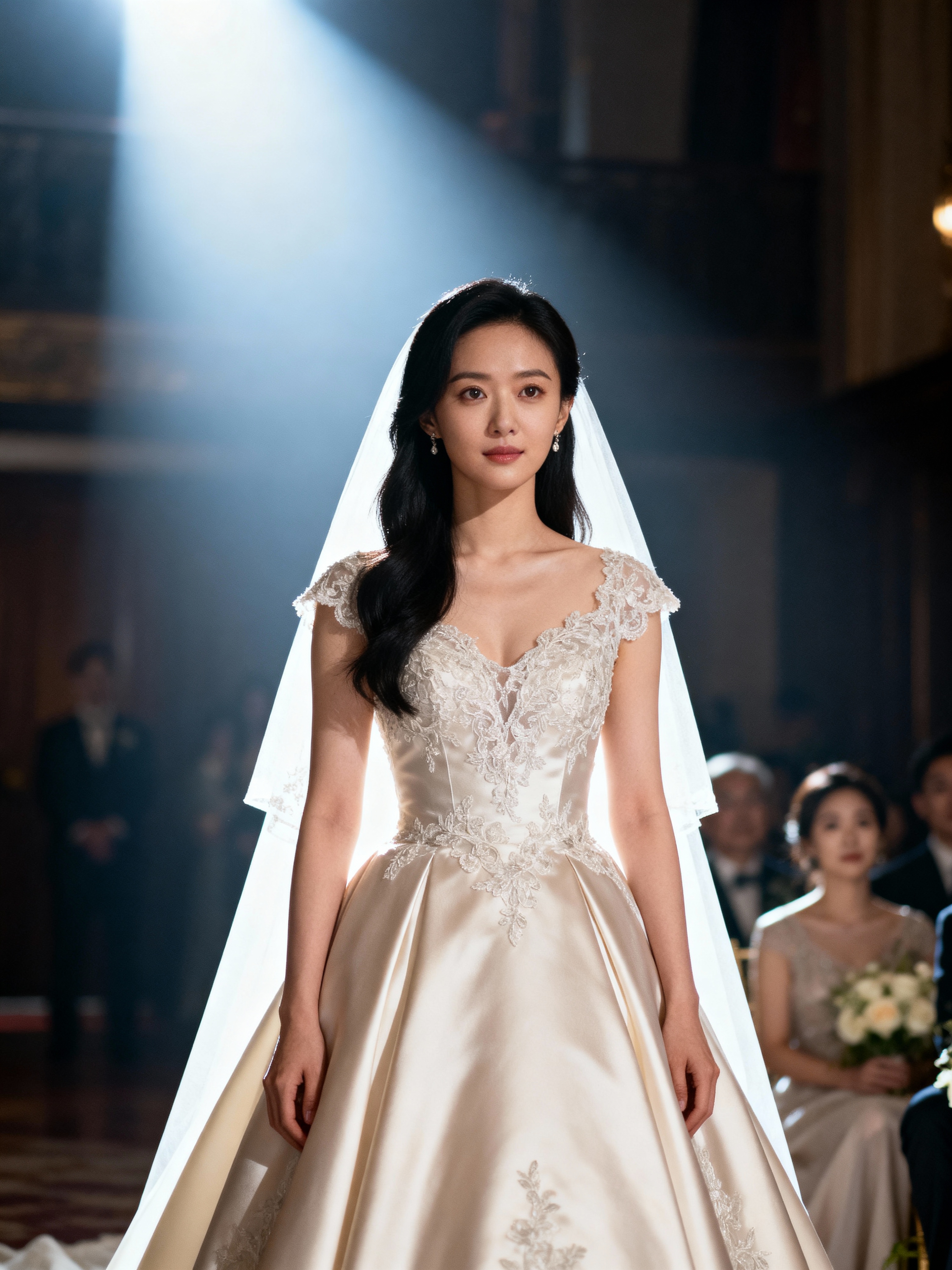 Classic wedding elegance in an intimate ceremony. Model wearing a silk A-line wedding dress with lace detailing . Romantic and sophisticated.