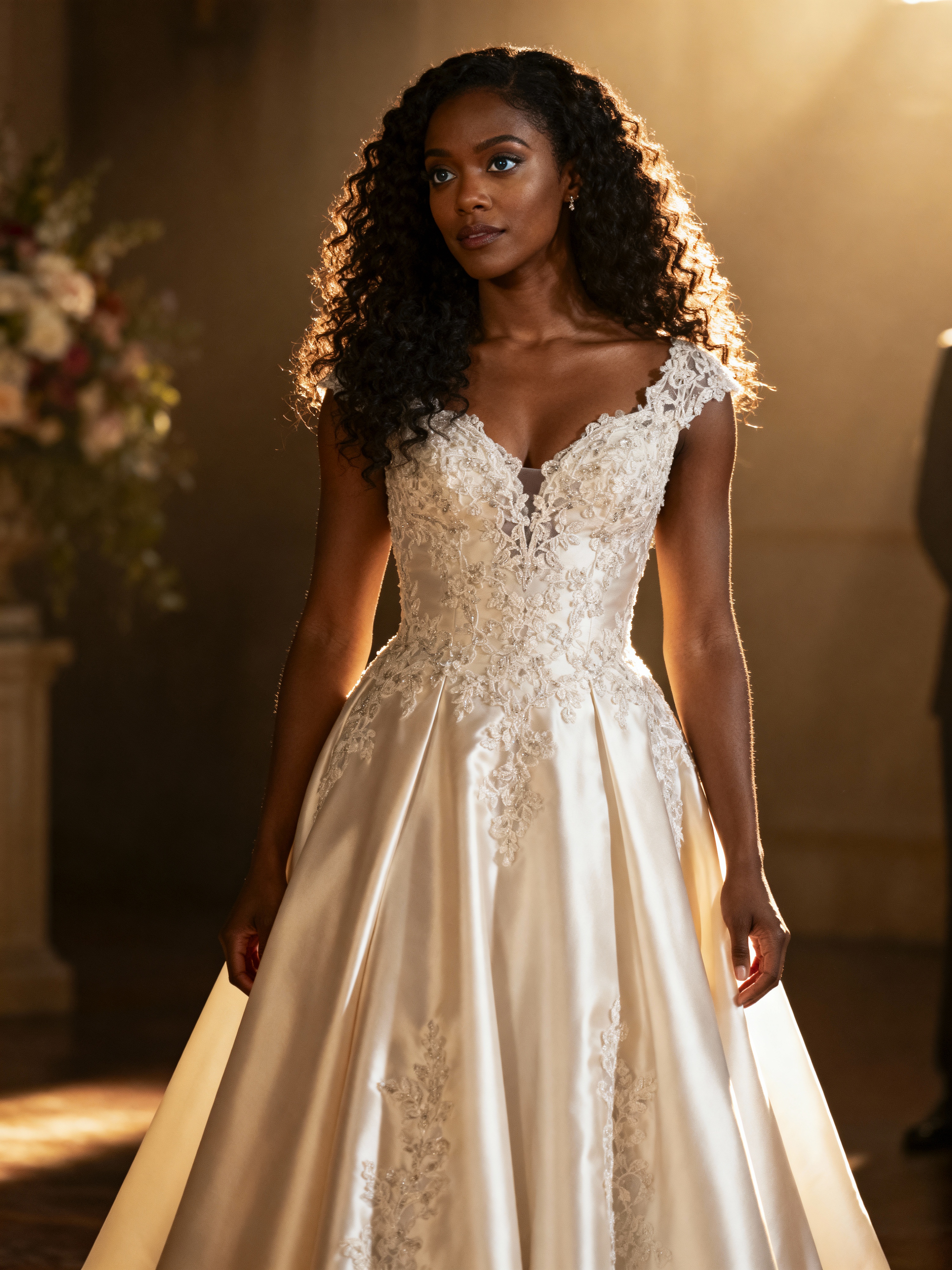 Classic wedding elegance in an intimate ceremony. Model wearing a silk A-line wedding dress with lace detailing . Romantic and sophisticated.
