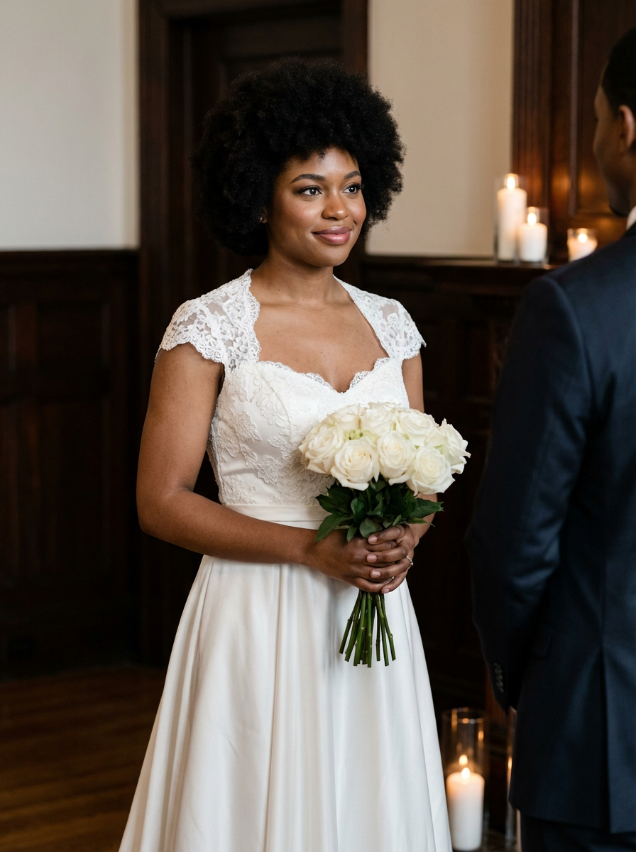 Classic wedding elegance in an intimate ceremony. Model wearing a silk A-line wedding dress with lace detailing . Romantic and sophisticated.