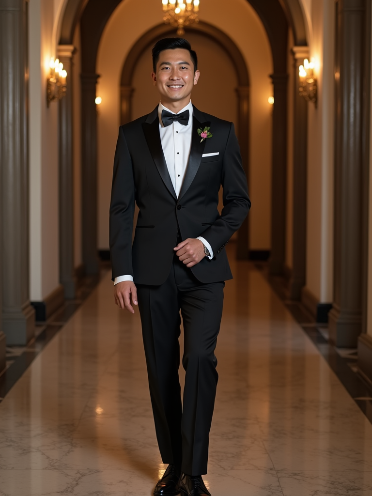 Classic wedding elegance in an intimate ceremony. Model wearing a stylish tuxedo with polished black shoes . Romantic and sophisticated.