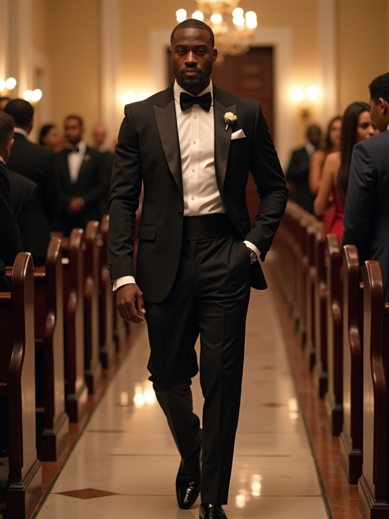 Classic wedding elegance in an intimate ceremony. Model wearing a stylish tuxedo with polished black shoes . Romantic and sophisticated.