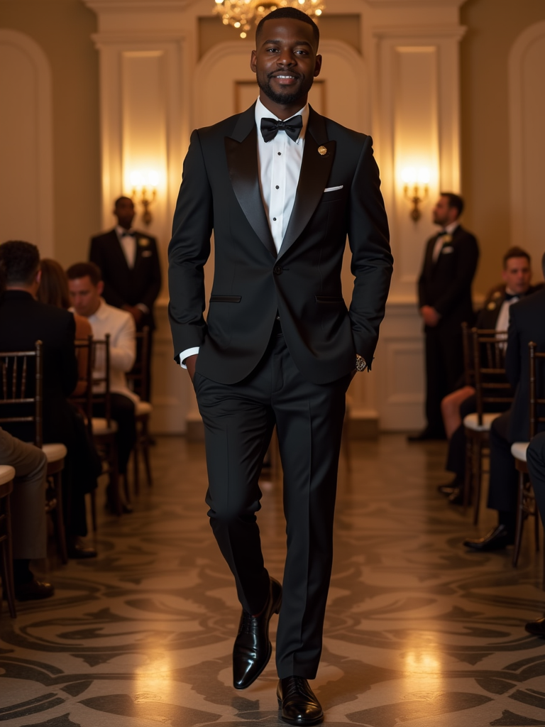Classic wedding elegance in an intimate ceremony. Model wearing a stylish tuxedo with polished black shoes . Romantic and sophisticated.