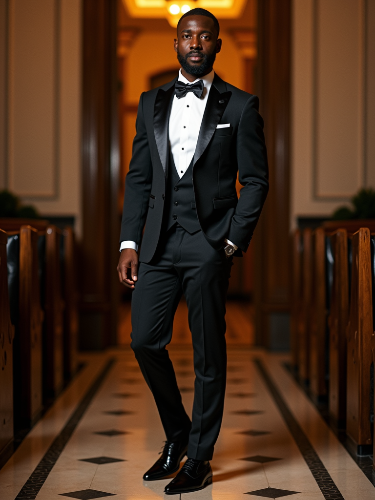 Classic wedding elegance in an intimate ceremony. Model wearing a stylish tuxedo with polished black shoes . Romantic and sophisticated.