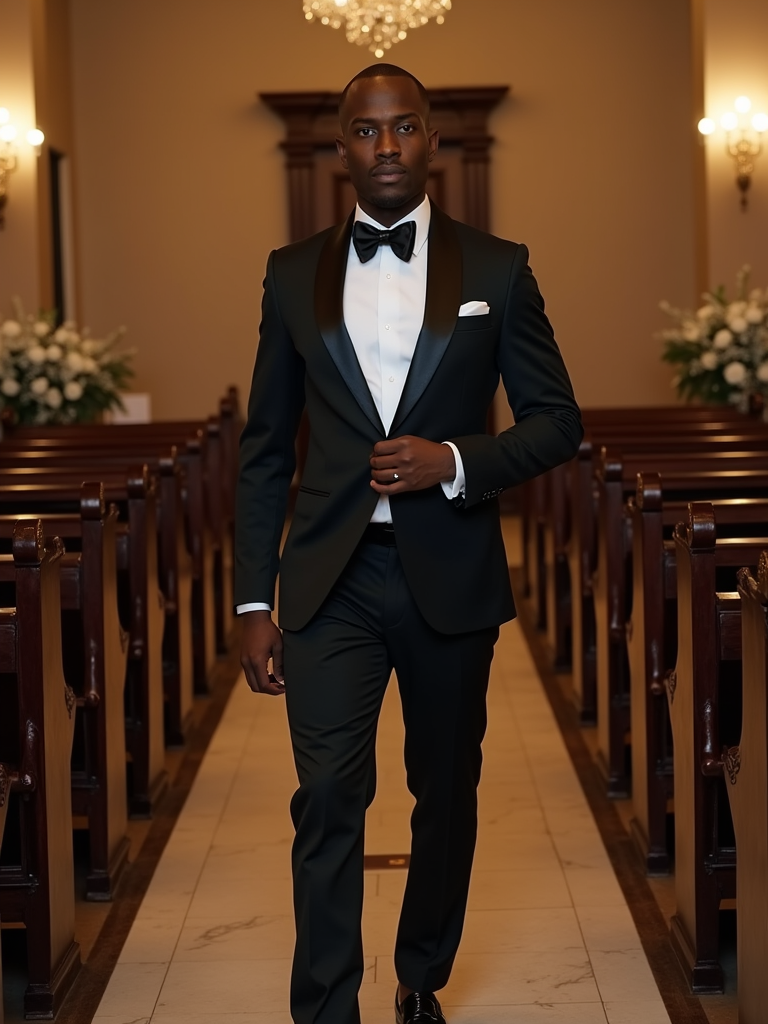 Classic wedding elegance in an intimate ceremony. Model wearing a stylish tuxedo with polished black shoes . Romantic and sophisticated.
