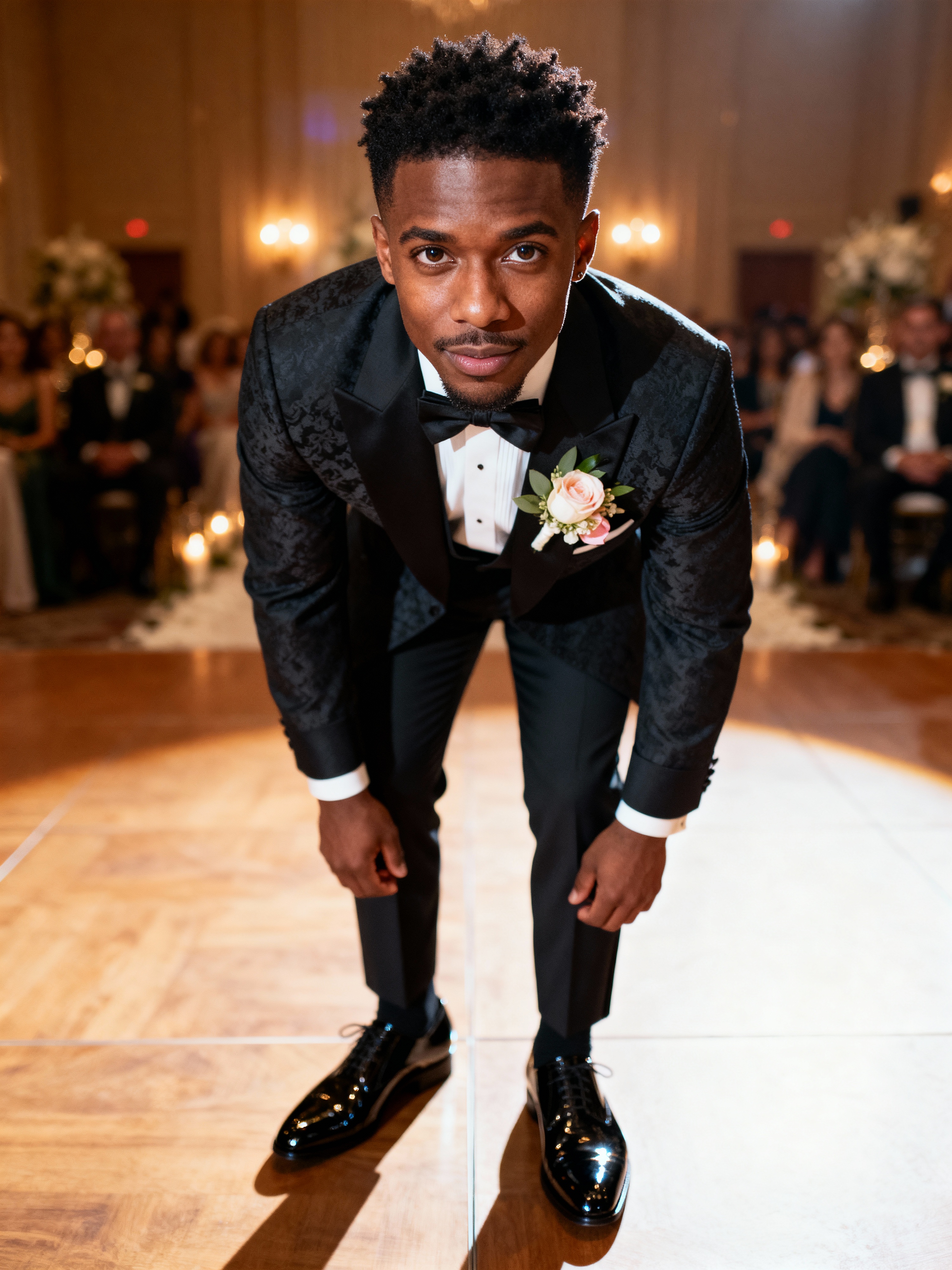 Classic wedding elegance in an intimate ceremony. Model wearing a stylish tuxedo with polished black shoes and boutonnière . Romantic and sophisticated.