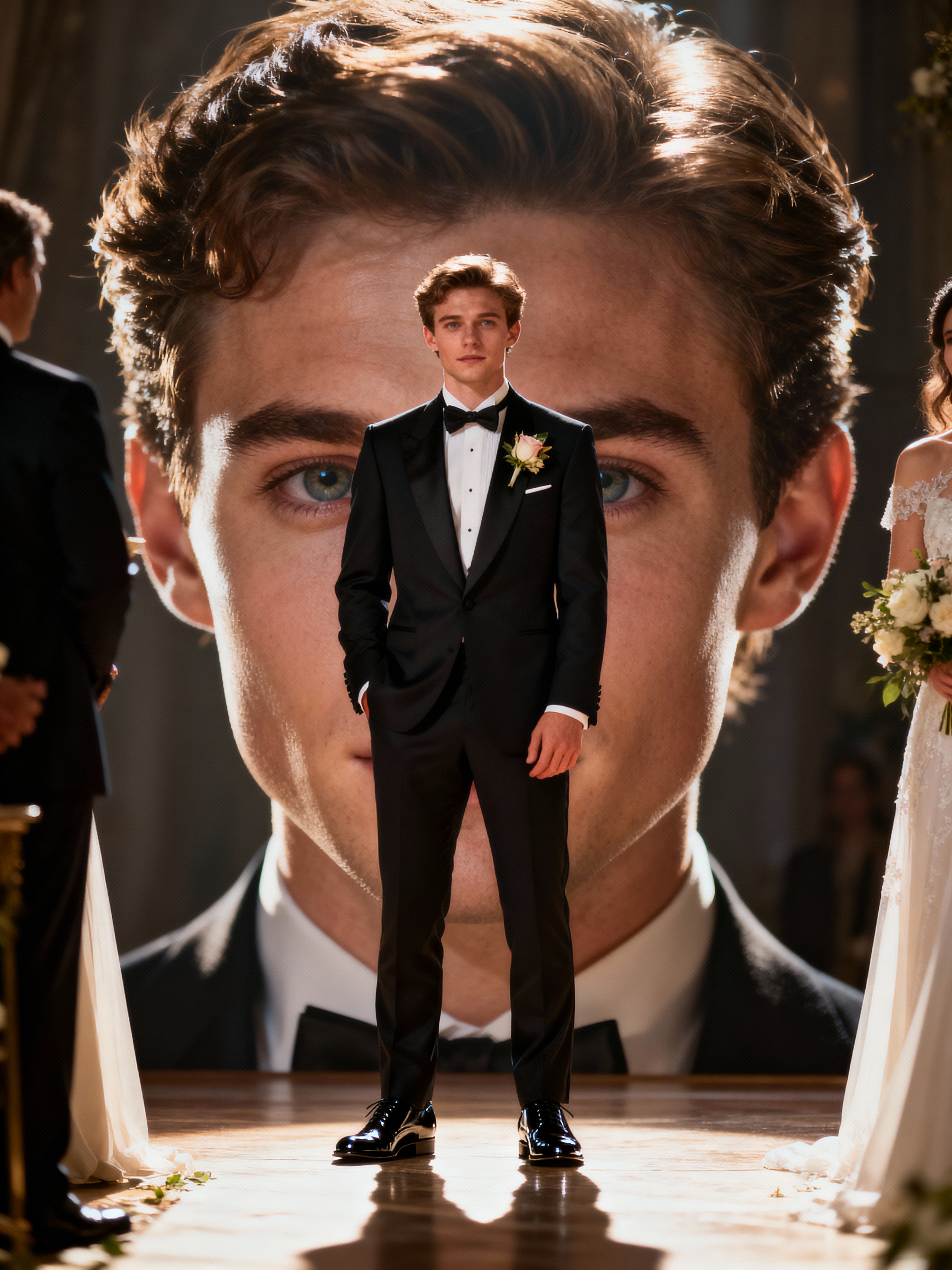 Classic wedding elegance in an intimate ceremony. Model wearing a stylish tuxedo with polished black shoes and boutonnière . Romantic and sophisticated.
