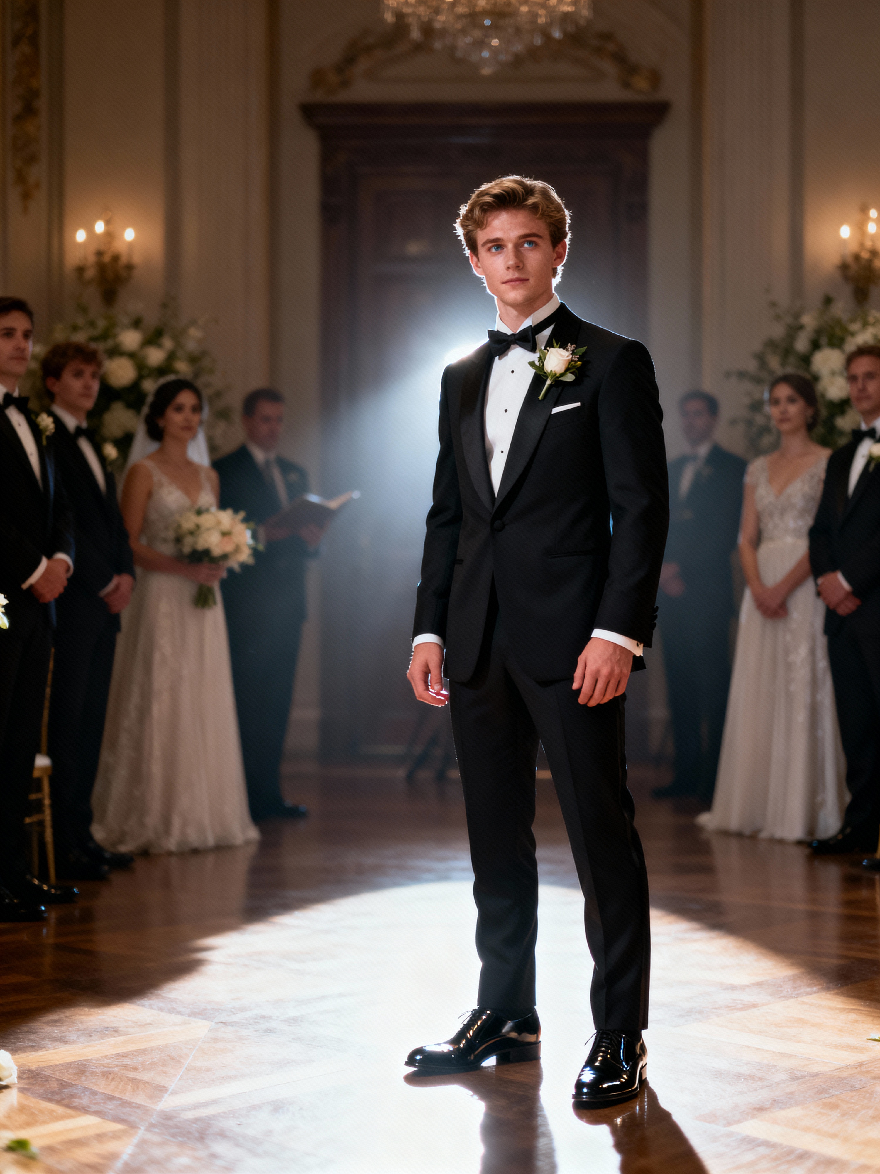 Classic wedding elegance in an intimate ceremony. Model wearing a stylish tuxedo with polished black shoes and boutonnière . Romantic and sophisticated.