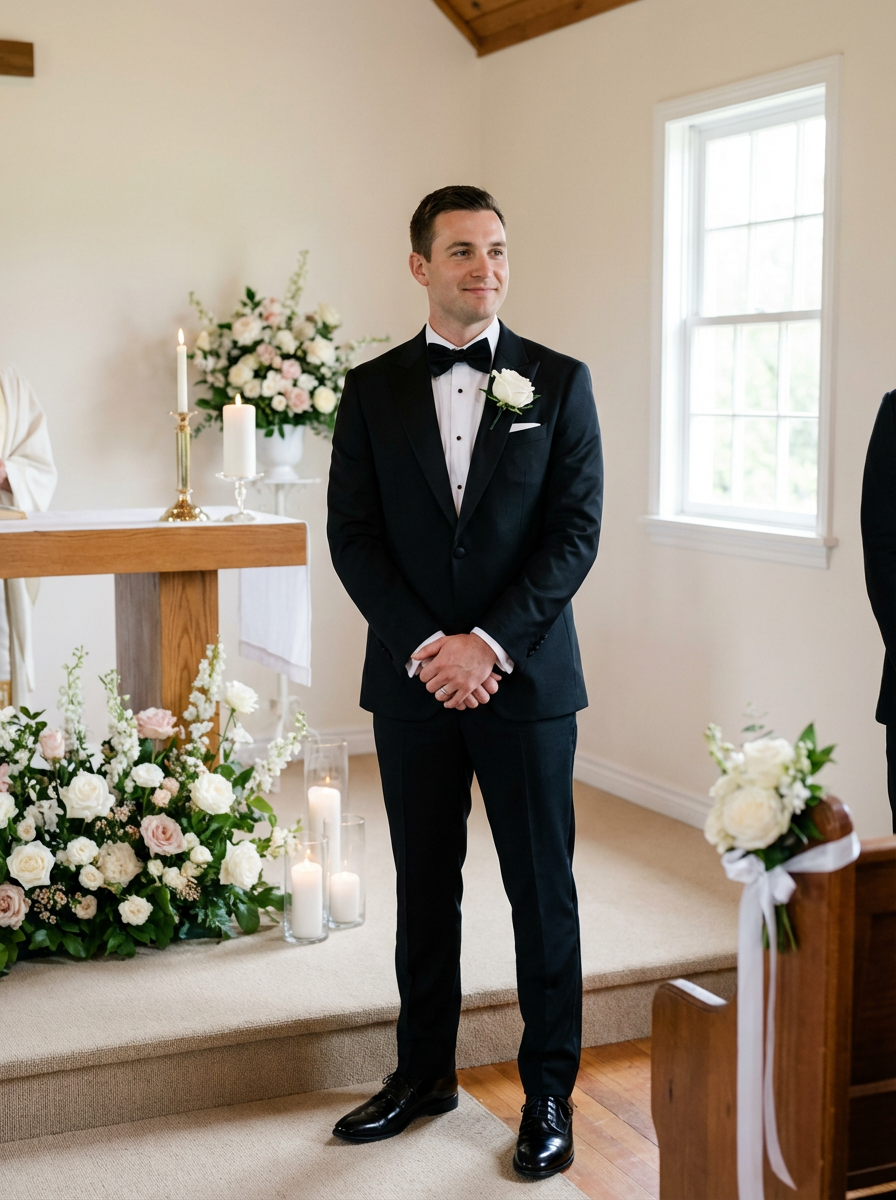 Classic wedding elegance in an intimate ceremony. Model wearing a stylish tuxedo with polished black shoes and boutonnière . Romantic and sophisticated.