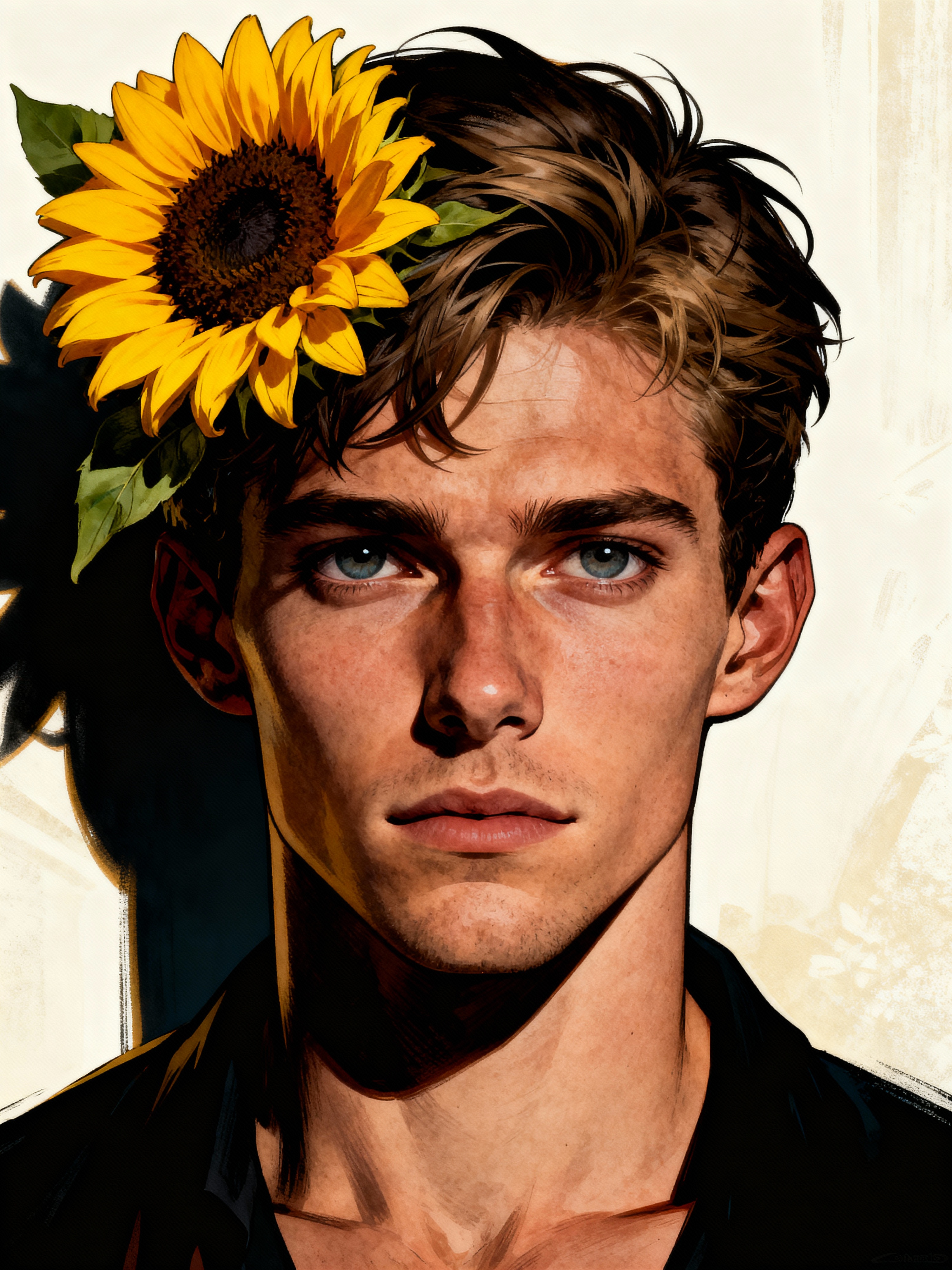 Close face shot of a model with a sunflower in hair, summer season, moody scene,, intricate, sharp details, summer vibe, gorgeous scene by gaston bussiere, craig mullins, somber lighting, drawn by giacomo burattini, inspired by graphic novel cover art, hyperrealistic, 8 k by rhads
