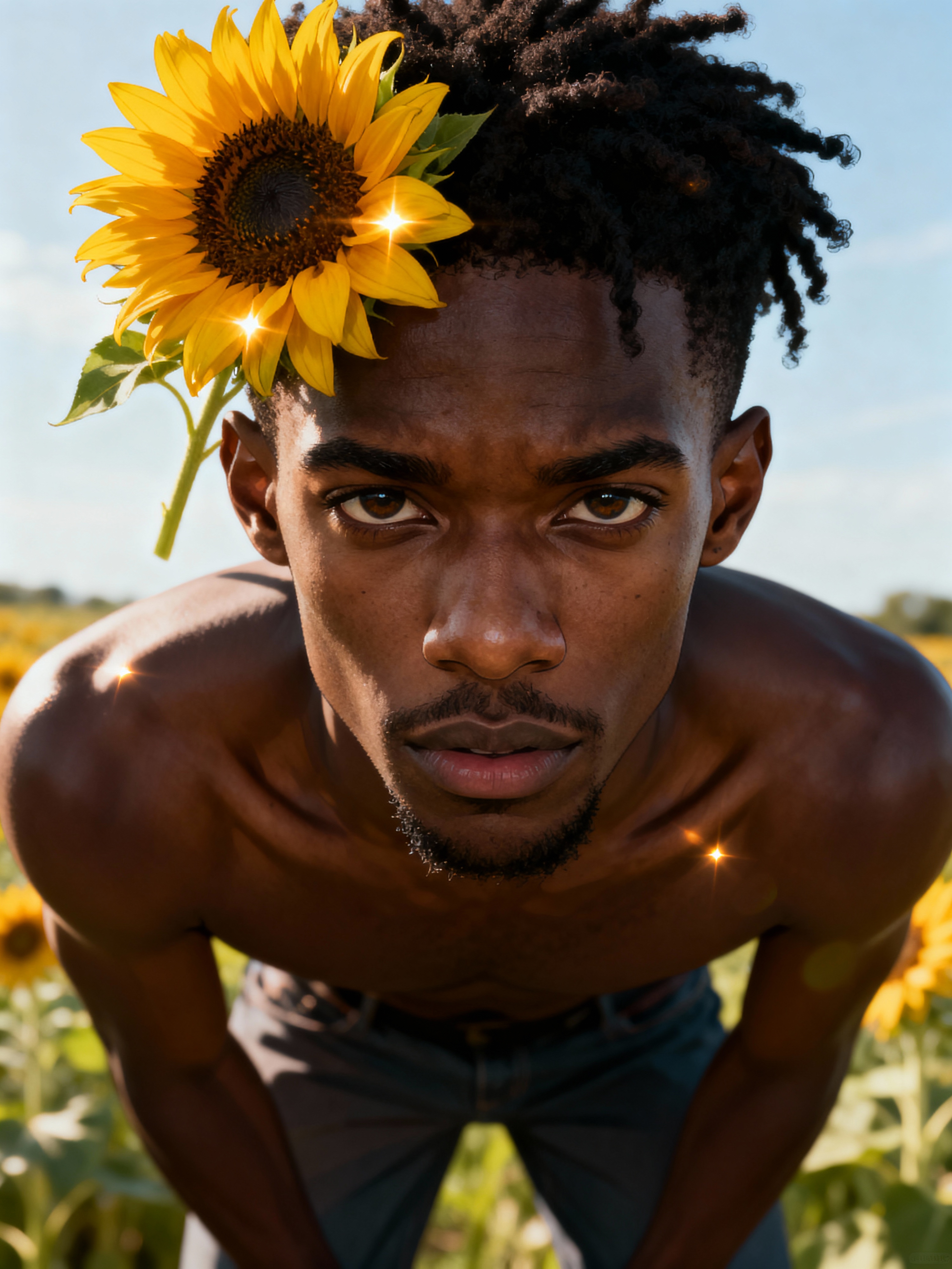 Close face shot of a model with a sunflower in hair, summer season, moody scene,, intricate, sharp details, summer vibe, gorgeous scene by gaston bussiere, craig mullins, somber lighting, drawn by giacomo burattini, inspired by graphic novel cover art, hyperrealistic, 8 k by rhads