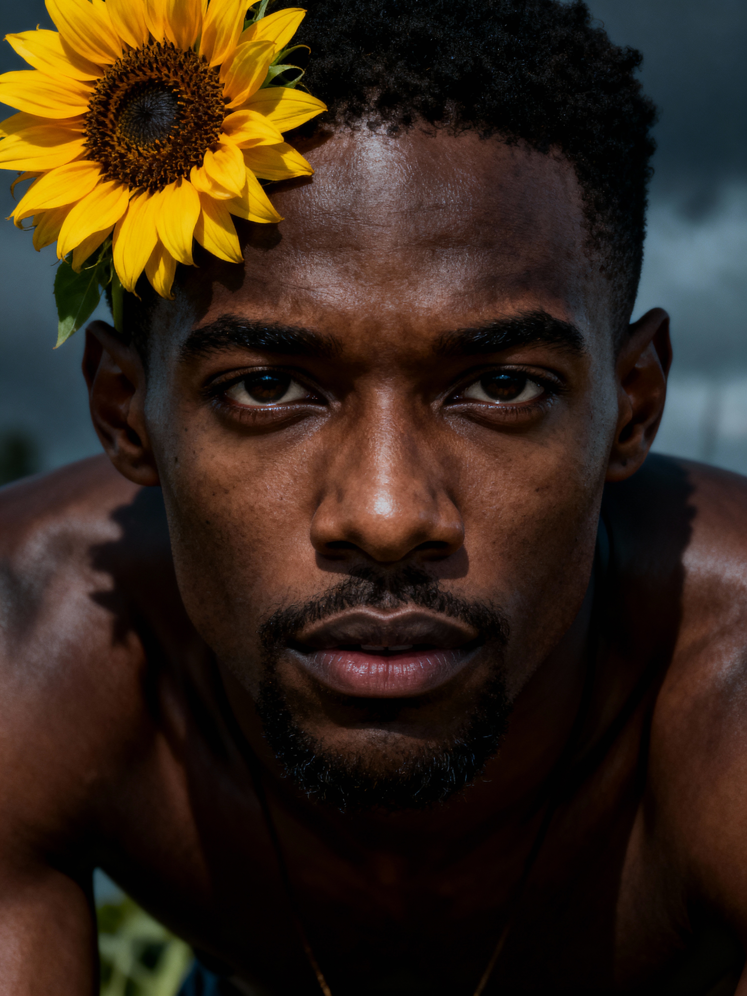 Close face shot of a model with a sunflower in hair, summer season, moody scene,, intricate, sharp details, summer vibe, gorgeous scene by gaston bussiere, craig mullins, somber lighting, drawn by giacomo burattini, inspired by graphic novel cover art, hyperrealistic, 8 k by rhads