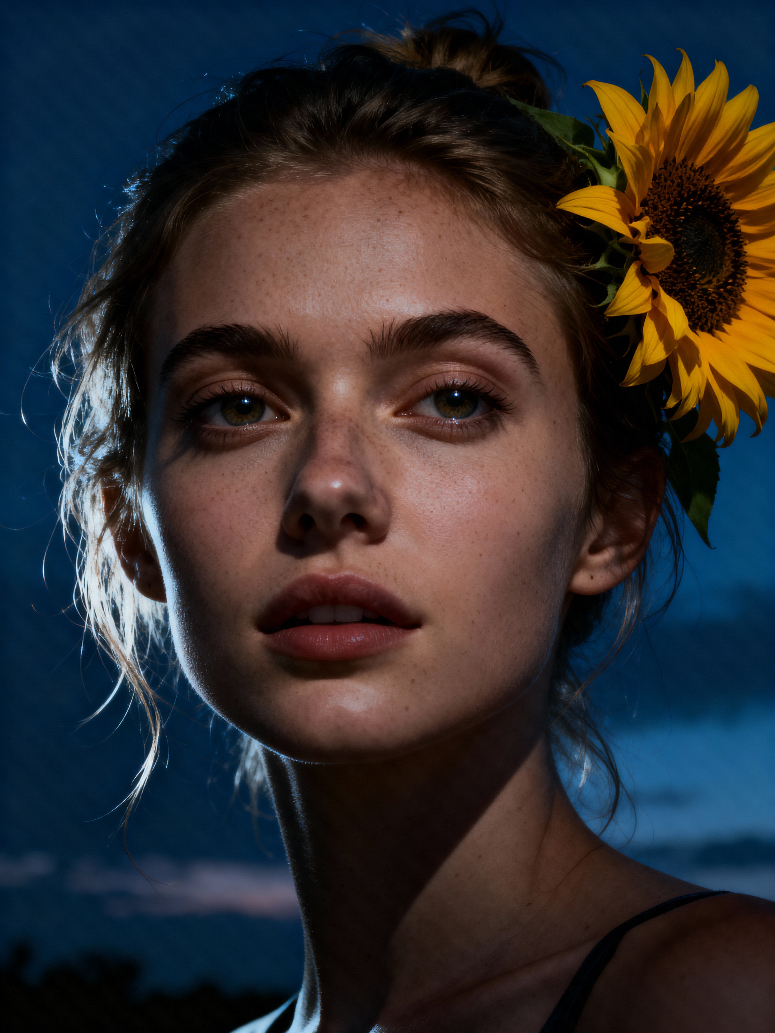 Close face shot of a model with a sunflower in hair, summer season, moody scene,, intricate, sharp details, summer vibe, gorgeous scene by gaston bussiere, craig mullins, somber lighting, drawn by giacomo burattini, inspired by graphic novel cover art, hyperrealistic, 8 k by rhads
