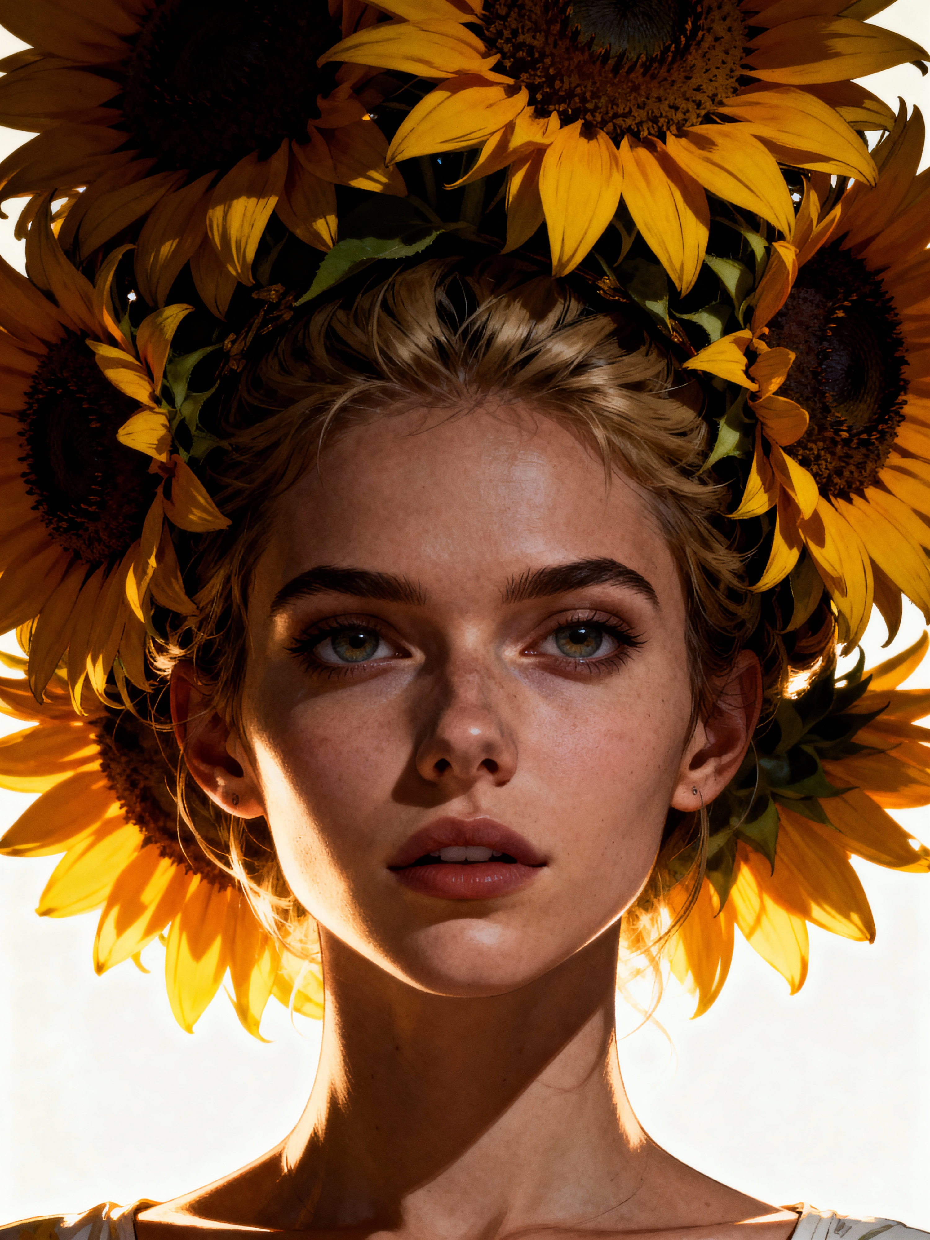 Close face shot of a model with a sunflower in hair, summer season, moody scene,, intricate, sharp details, summer vibe, gorgeous scene by gaston bussiere, craig mullins, somber lighting, drawn by giacomo burattini, inspired by graphic novel cover art, hyperrealistic, 8 k by rhads