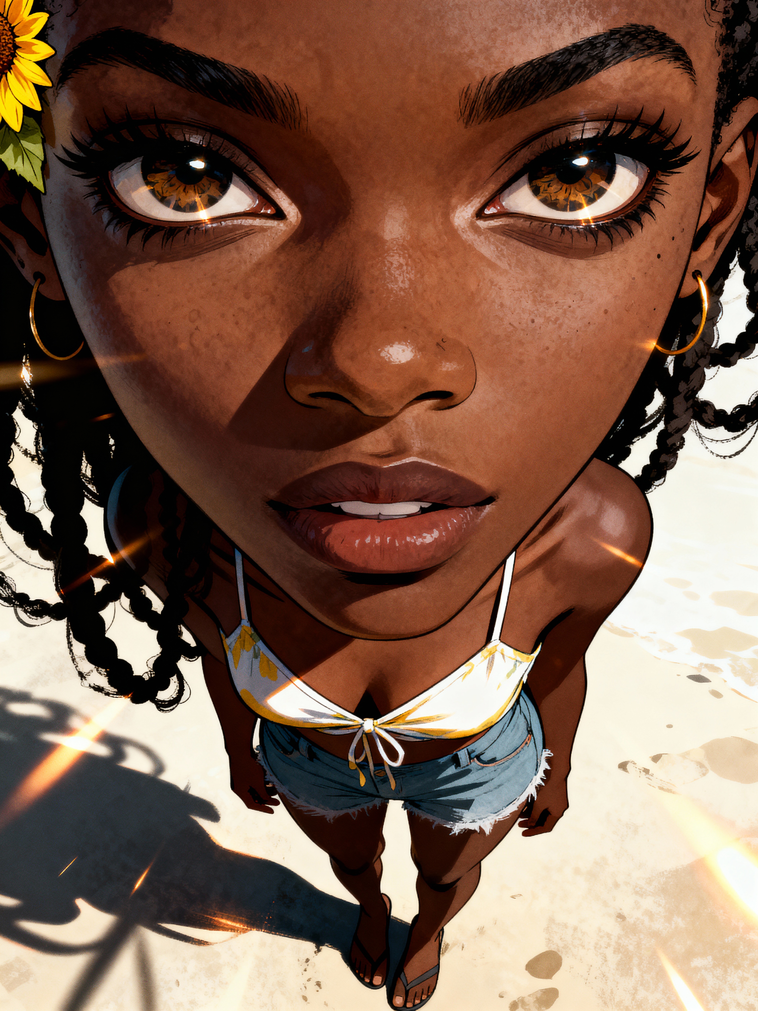 Close face shot of a model with a sunflower in hair, summer season, moody scene,, intricate, sharp details, summer vibe, gorgeous scene by gaston bussiere, craig mullins, somber lighting, drawn by giacomo burattini, inspired by graphic novel cover art, hyperrealistic, 8 k by rhads
