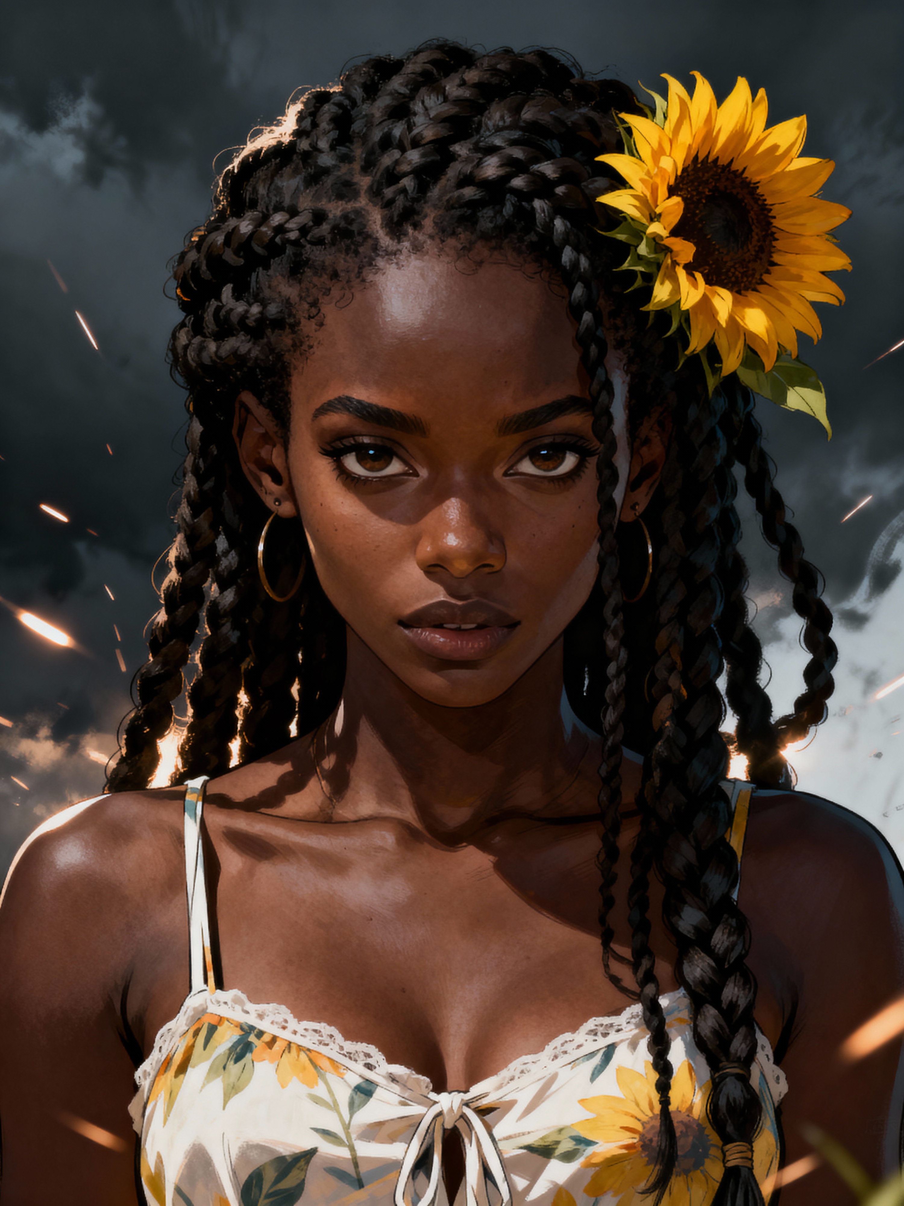 Close face shot of a model with a sunflower in hair, summer season, moody scene,, intricate, sharp details, summer vibe, gorgeous scene by gaston bussiere, craig mullins, somber lighting, drawn by giacomo burattini, inspired by graphic novel cover art, hyperrealistic, 8 k by rhads