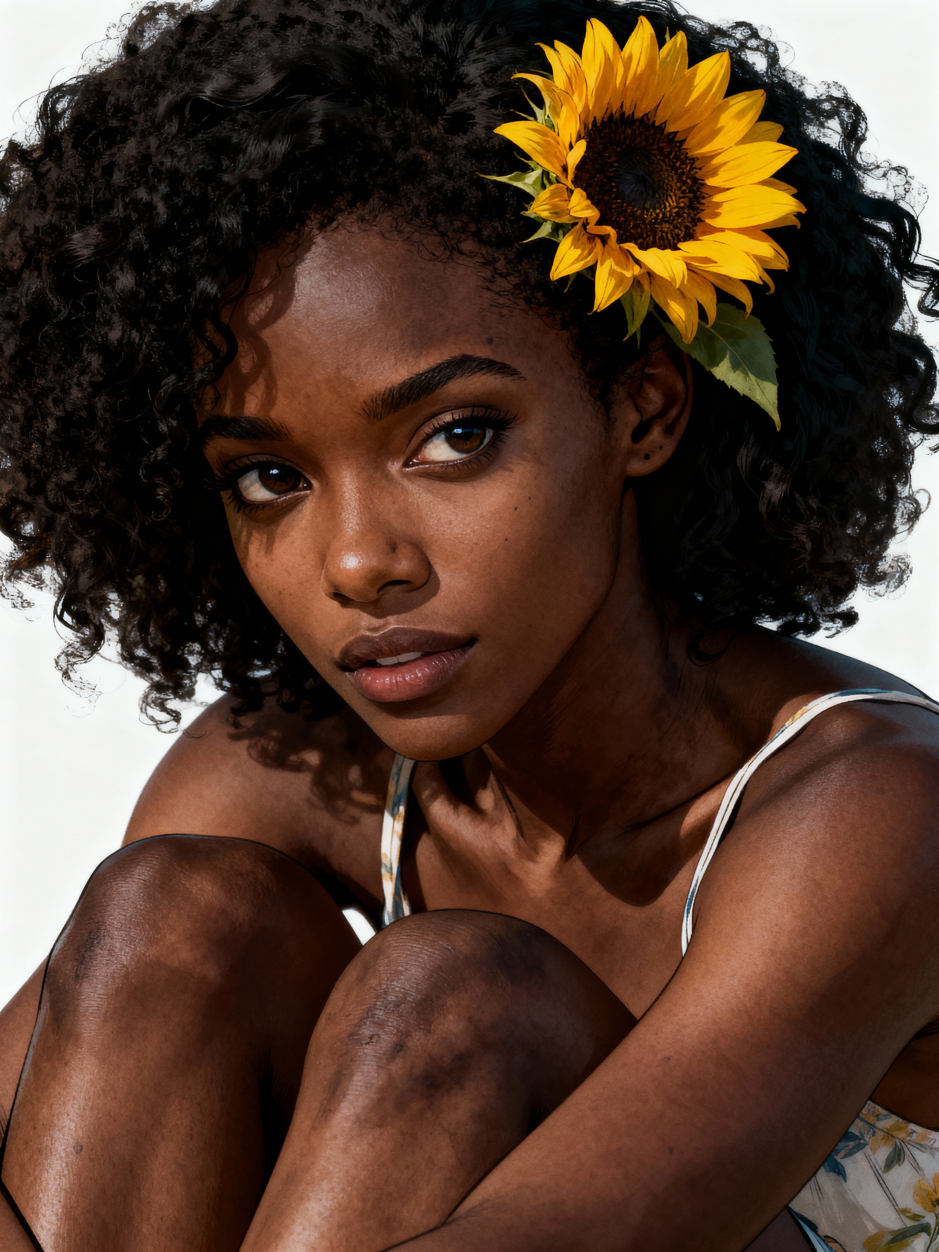 Close face shot of a model with a sunflower in hair, summer season, moody scene,, intricate, sharp details, summer vibe, gorgeous scene by gaston bussiere, craig mullins, somber lighting, drawn by giacomo burattini, inspired by graphic novel cover art, hyperrealistic, 8 k by rhads