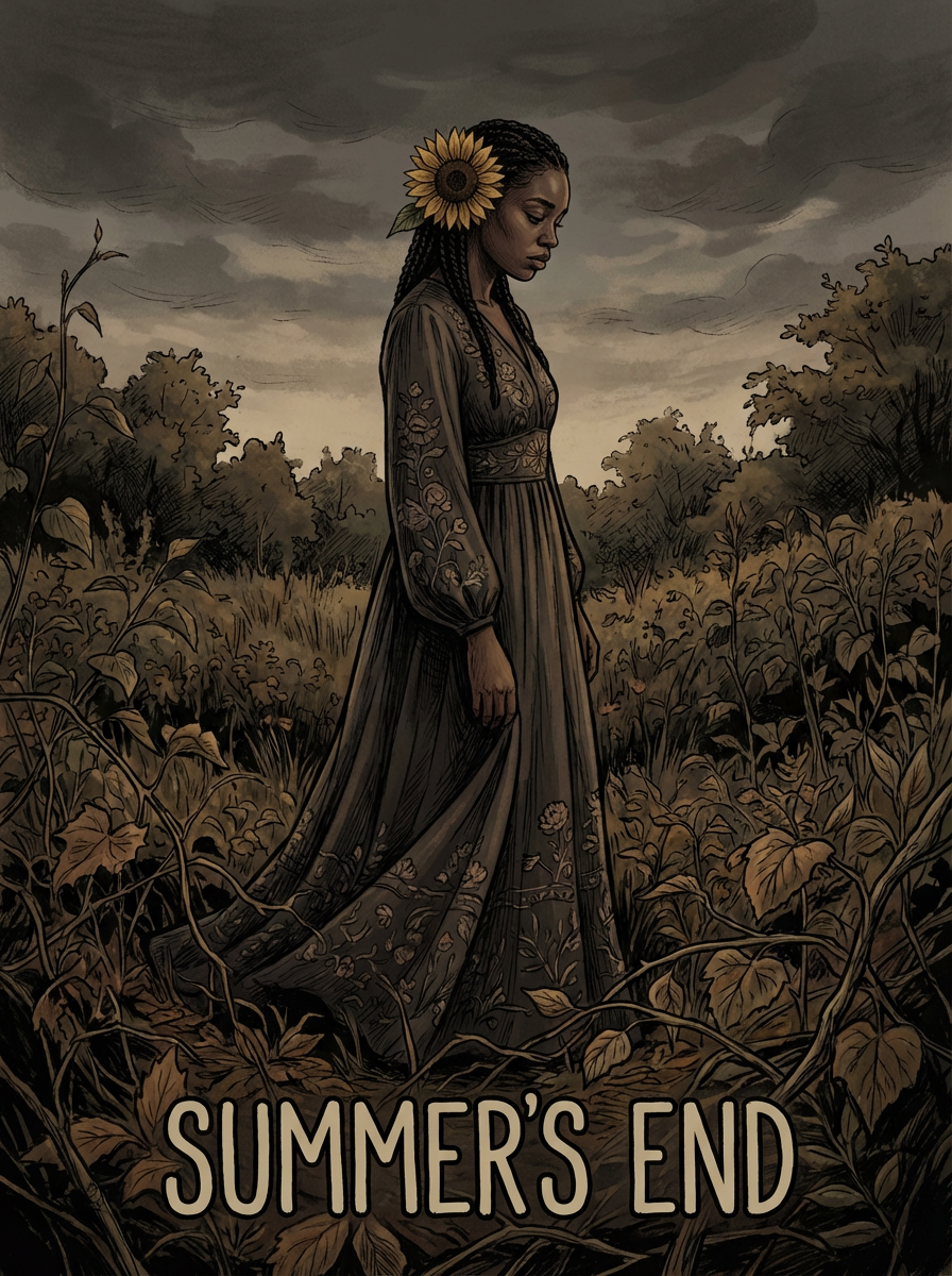 Close face shot of a model with a sunflower in hair, summer season, moody scene,, intricate, sharp details, summer vibe, gorgeous scene by gaston bussiere, craig mullins, somber lighting, drawn by giacomo burattini, inspired by graphic novel cover art, hyperrealistic, 8 k by rhads