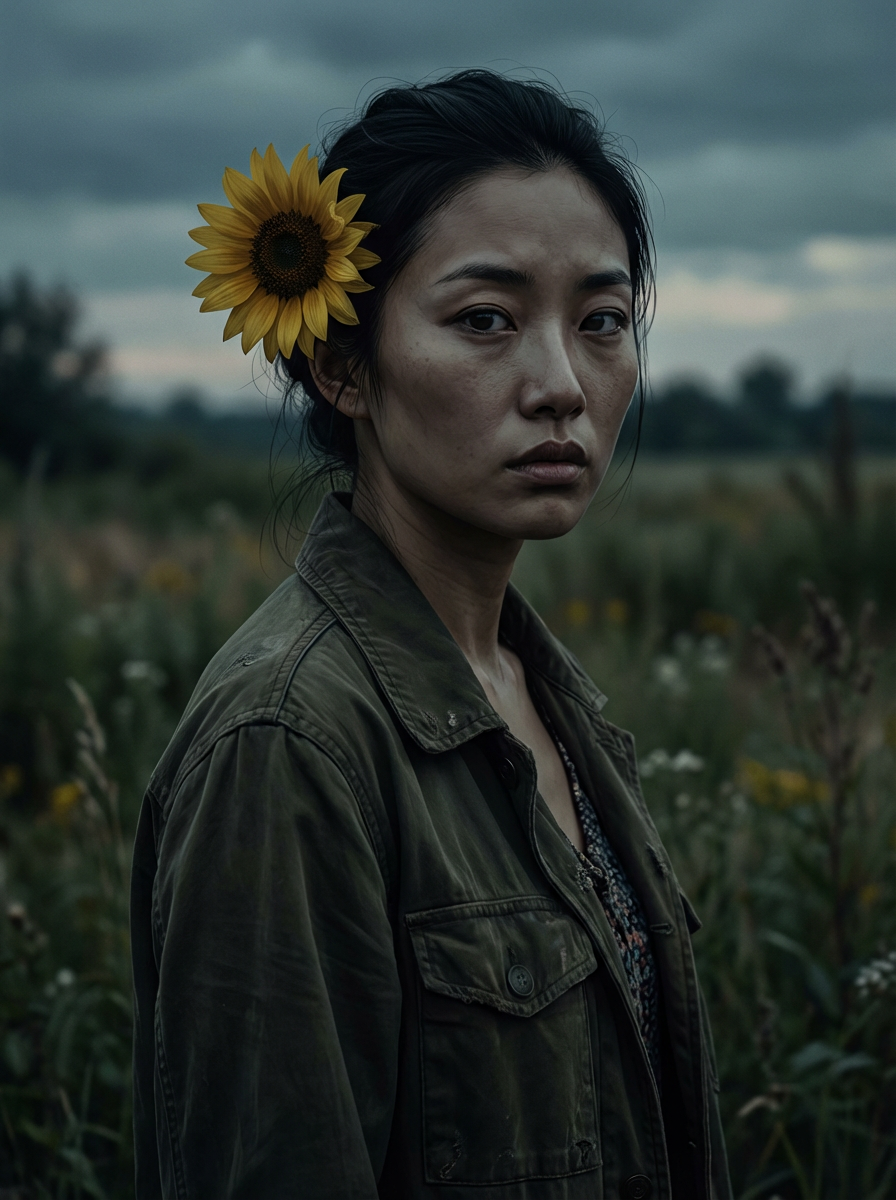 Close face shot of a model with a sunflower in hair, summer season, moody scene,, intricate, sharp details, summer vibe, gorgeous scene by gaston bussiere, craig mullins, somber lighting, drawn by giacomo burattini, inspired by graphic novel cover art, hyperrealistic, 8 k by rhads