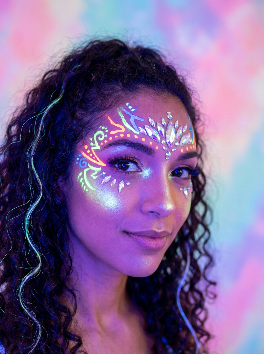 close-up of Artistic makeup with face jewels and iridescent highlighter, captured under a UV light for a glowing effect. set against a soft, pastel background